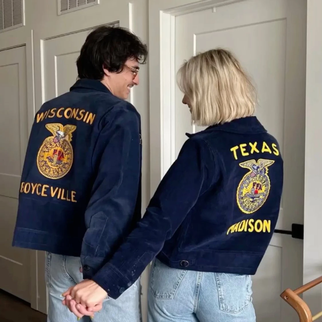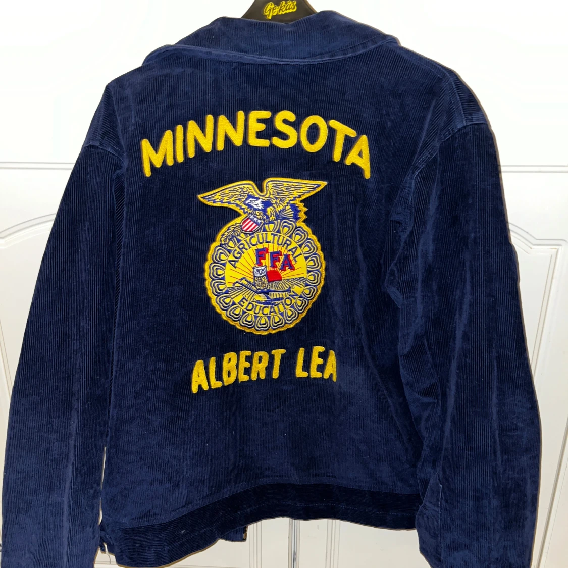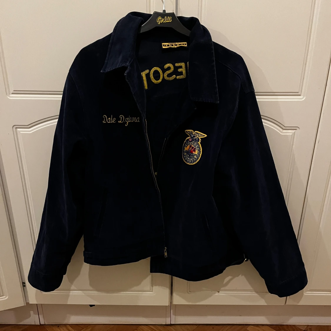 Säljer en mörkblå jacka med broderade detaljer på ryggen. Jackan har en dragkedja framtill och är långärmad. Perfekt för dig som vill ha en unik stil med en touch av retro. Det är en Vintage FFA jacka. Storlek M, passar folk 177-185 skulle jag säga. Croppad fit och lite bredare, boxy. Priset är förhandlingsbart vid snabb affär. DM för fler frågor eller funderingar