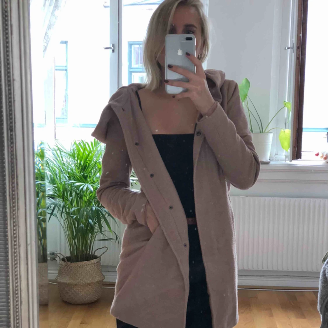 Jätteskön höstjacka i ljusrosa, stor luva, dragkedja och knäppning, använd väldigt sparsamt under en säsong. Frakt tillkommer.