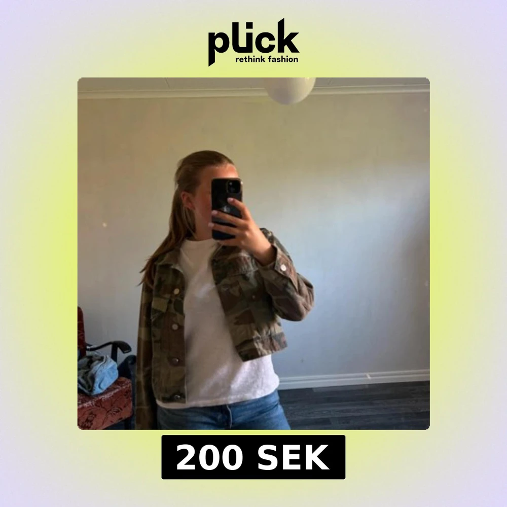 Säljer en croppad jeansjacka med camouflagemönster i gröna och bruna toner. Jackan har långa ärmar, knappar framtill och klassiska fickor på bröstet. Perfekt för dig som vill ha en edgy och cool stil.
