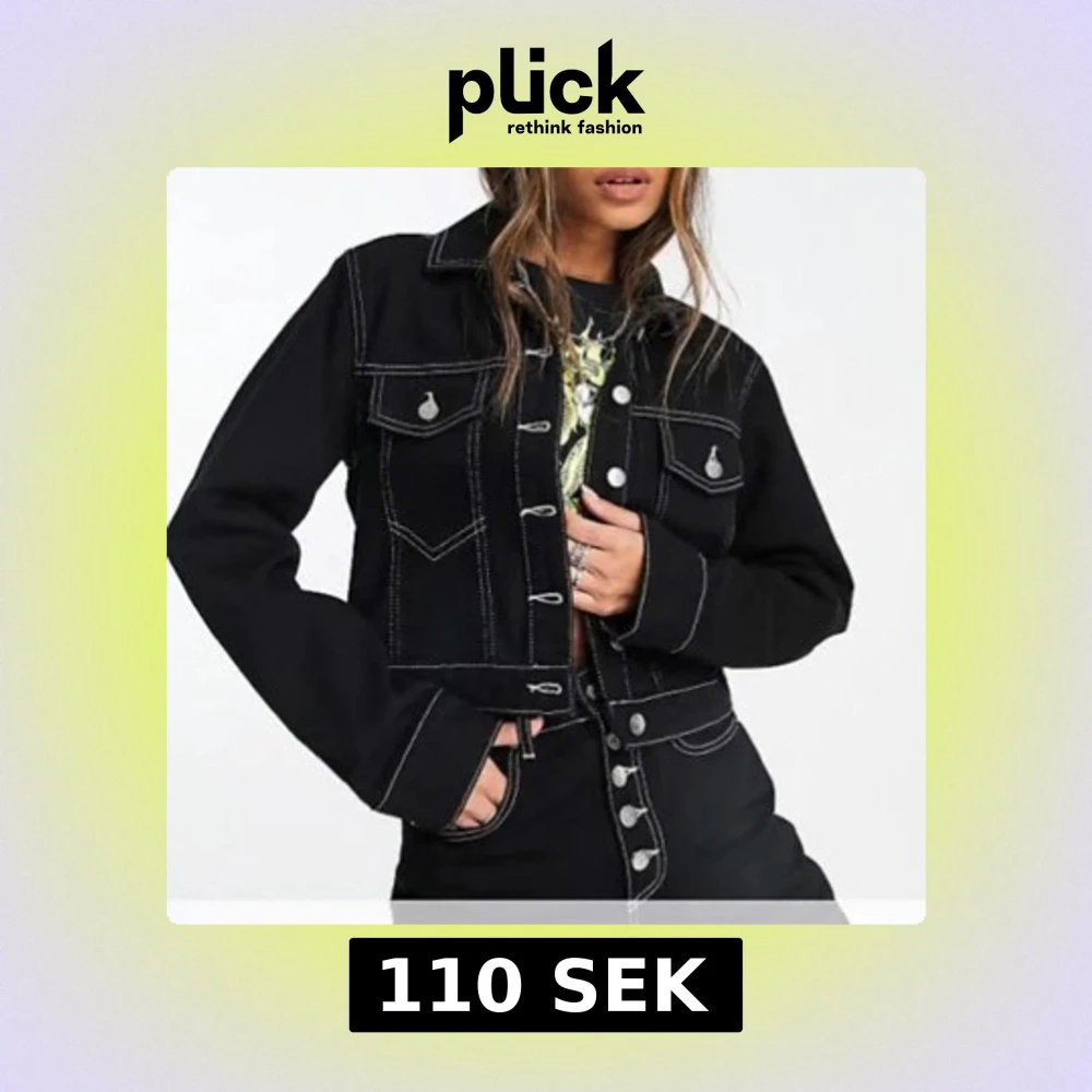 En jättesnygg svart jeansjacka med vita sömmar, den är croppad, storlek xs men skulle säga att den passar s med! Mycket använd men har inga defekter alls🖤skriv för fler bilder