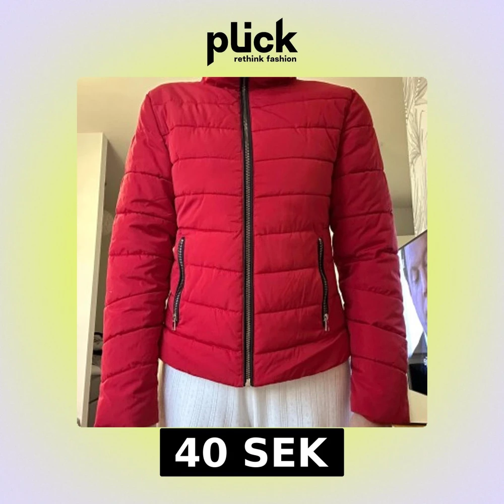 Säljer en röd pufferjacka med svarta detaljer och två sneda fickor med dragkedjor. Jackan har quiltad design, hög krage och hel dragkedja framtill. Perfekt för kyliga dagar och ger en cool vibe till din outfit. Jag bär storlek S och den passar
