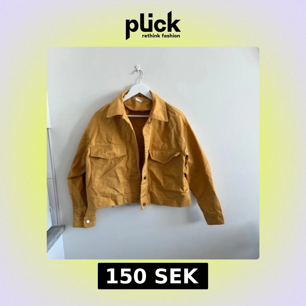 Säljer en gul croppad jacka med stora bröstfickor och klassisk krage. Jackan har knappar framtill och vid ärmsluten. Perfekt för dig som vill ha en färgklick i garderoben!