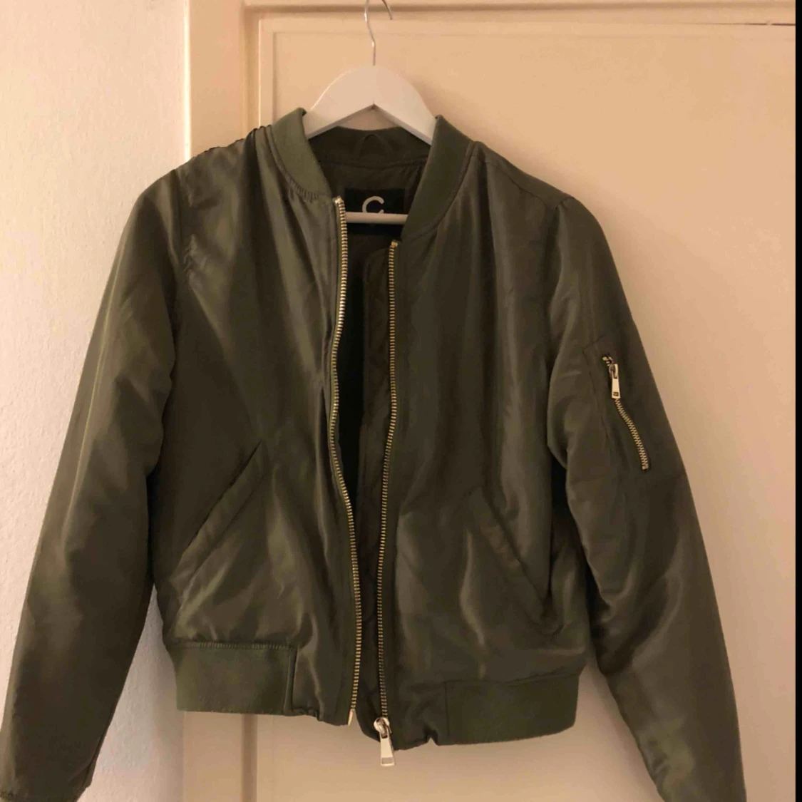Grön bomberjacka i fint skick med gulddragkedja på ena ärmen. Köparen står för frakten.