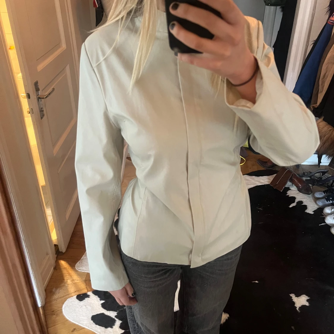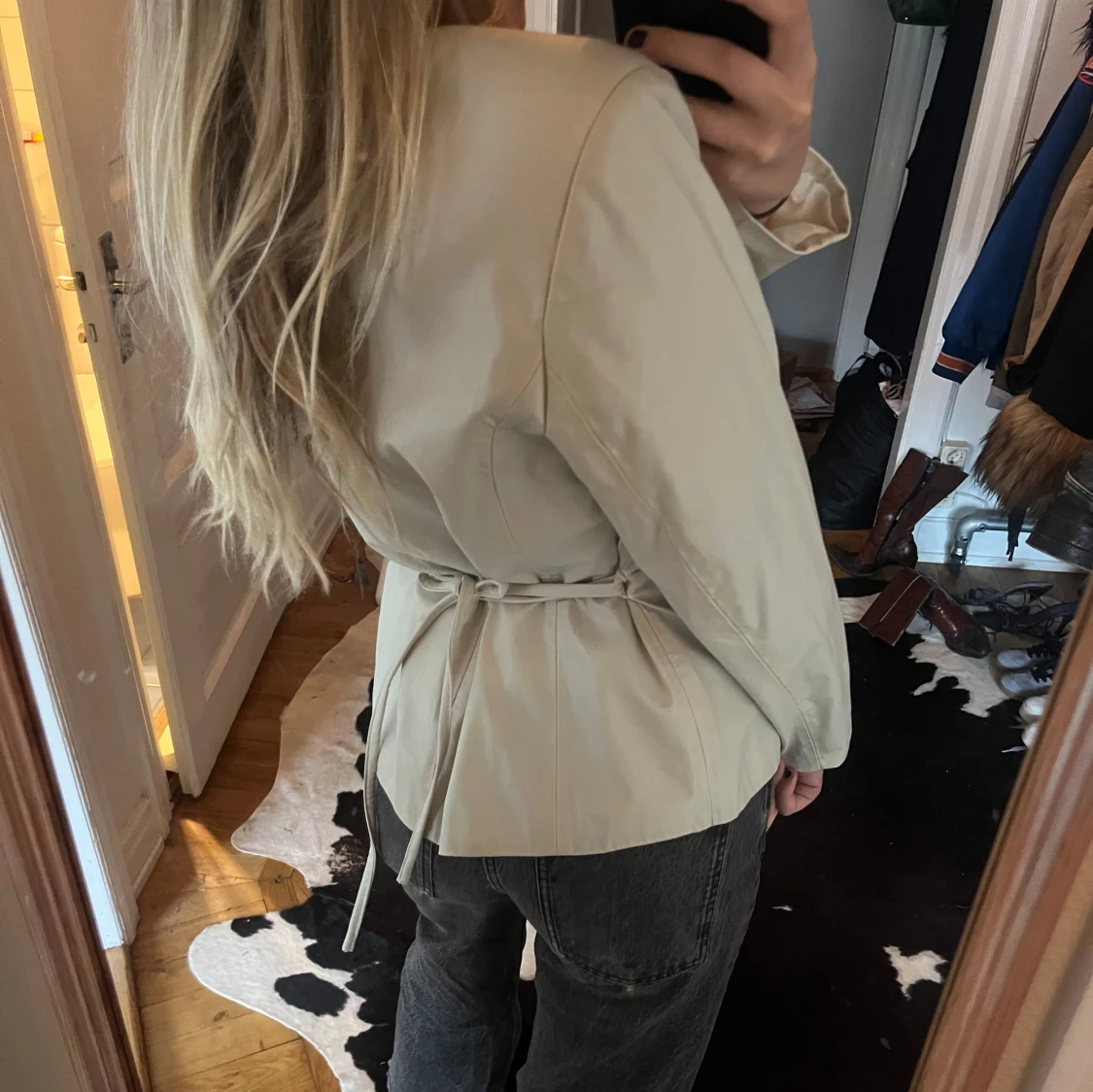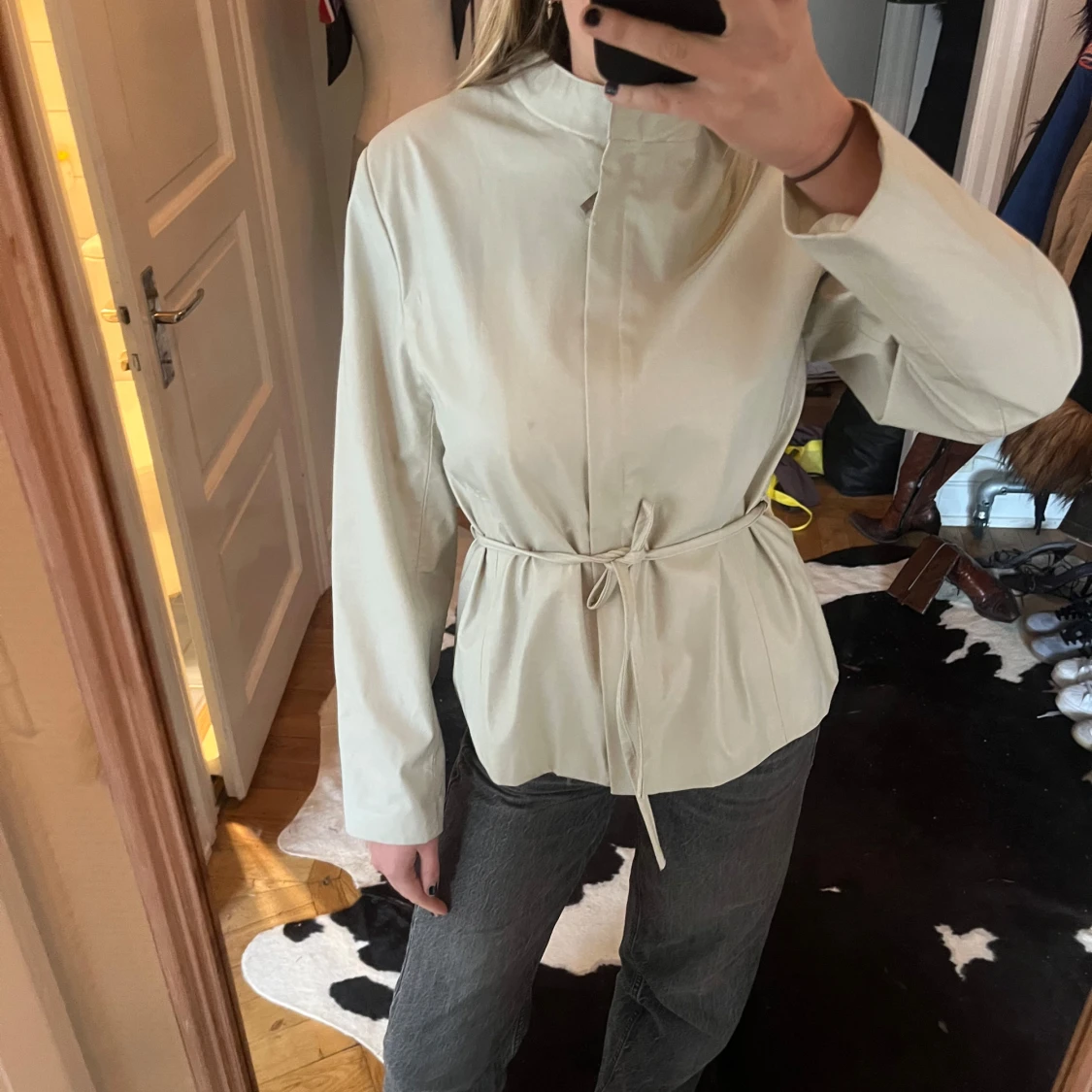 Supersnygg krämvit jacka i fuskskinn. Knappast använd. Går att ha på flera sätt som ni ser på bilderna.