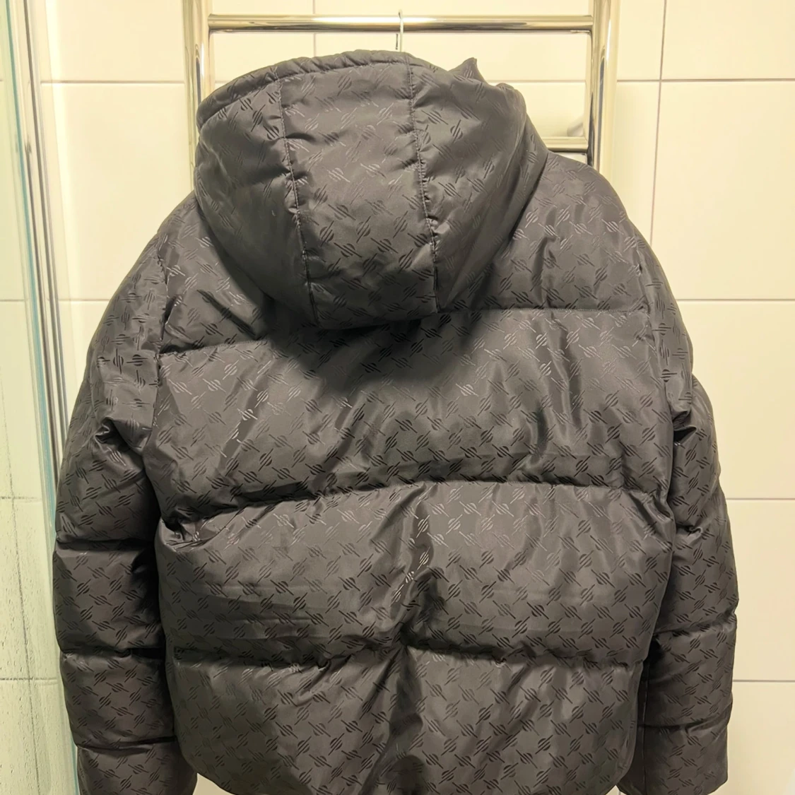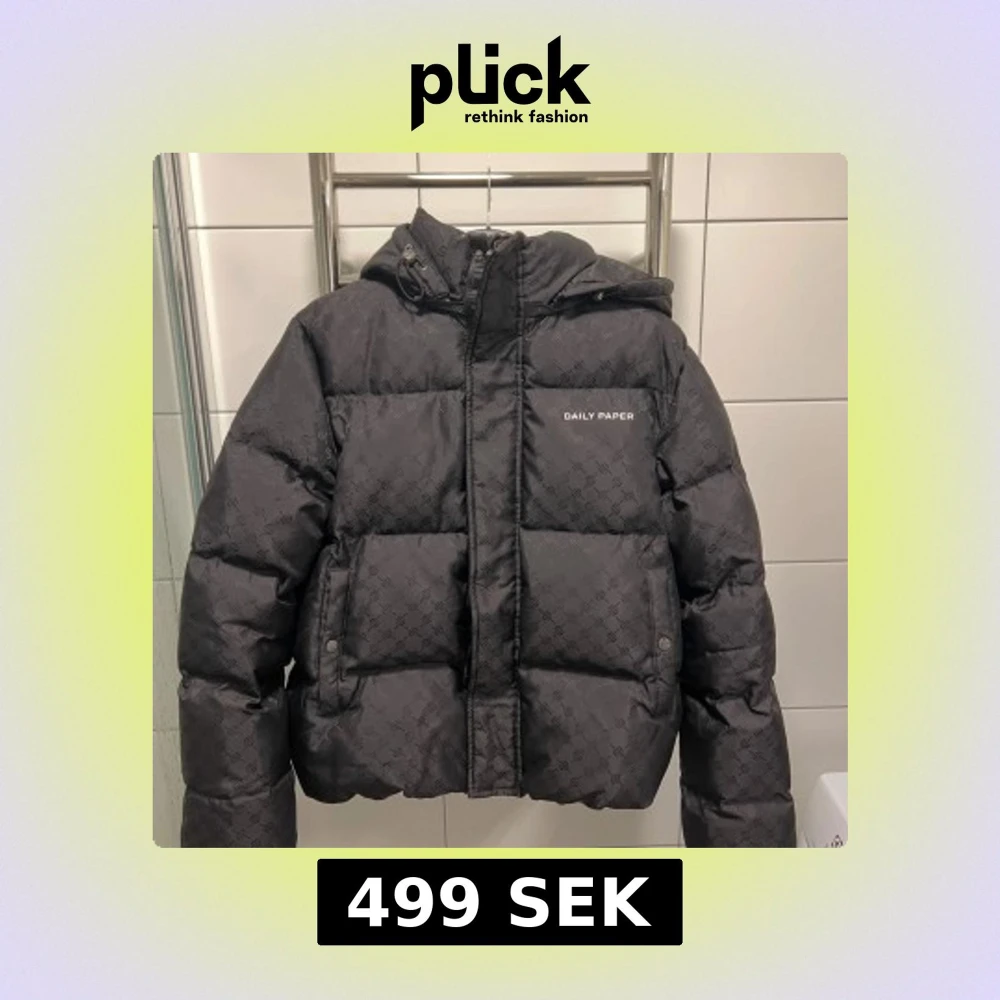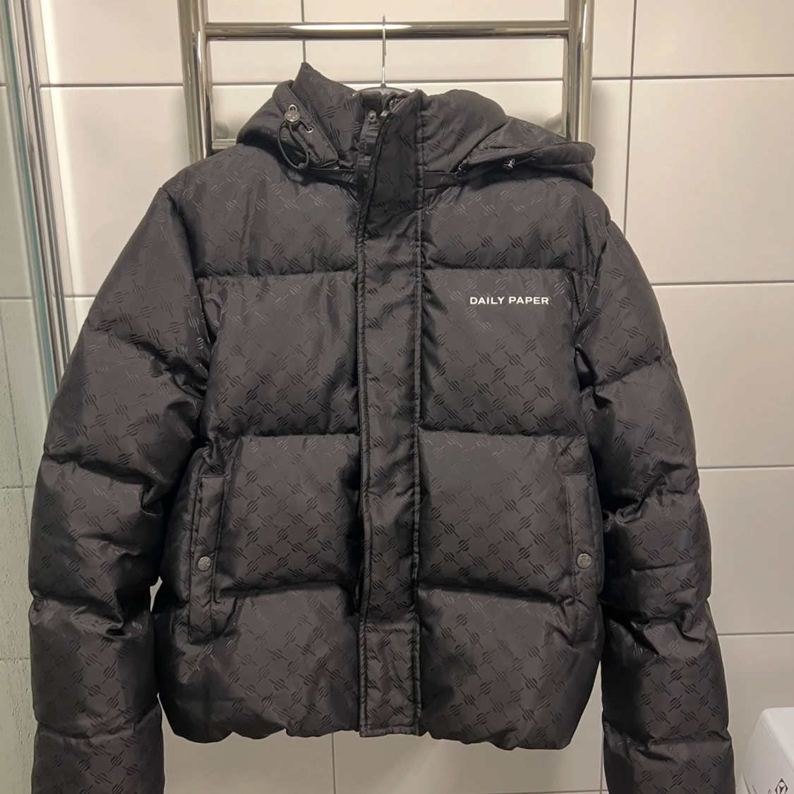 Svart Daily Paper jacka med mönster. Jackan har en huva och är vadderad. Storlek M