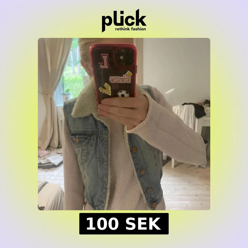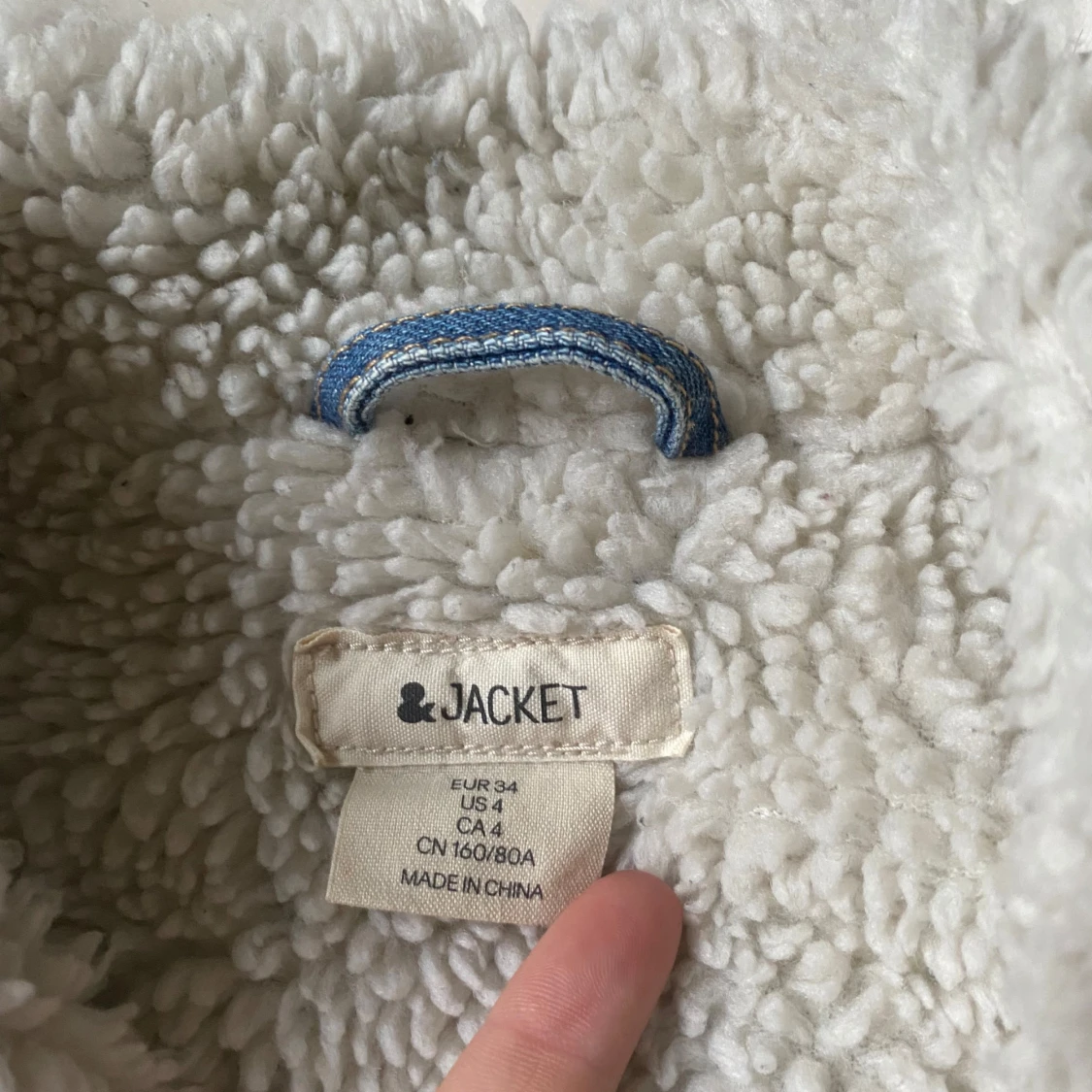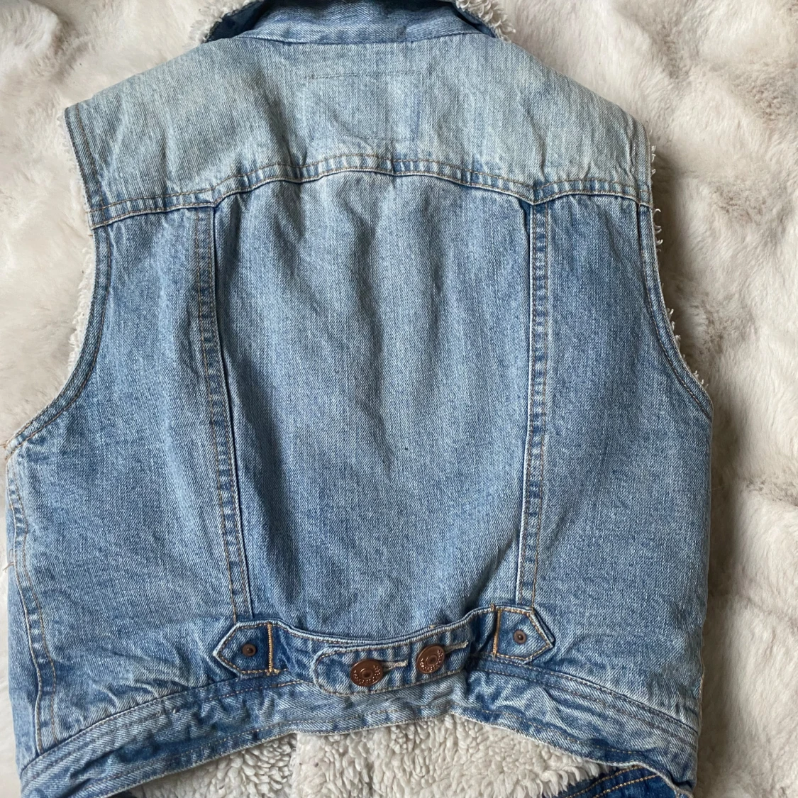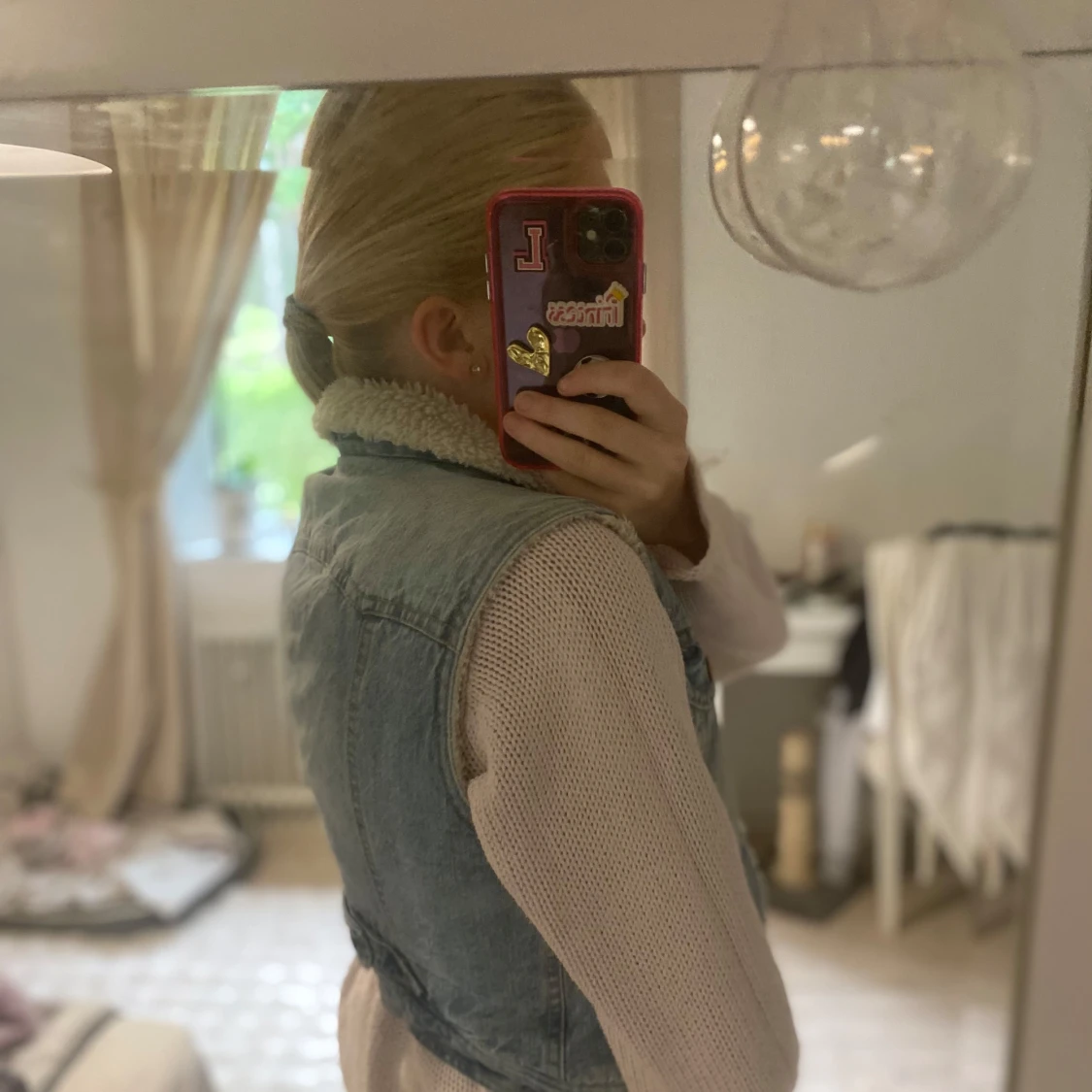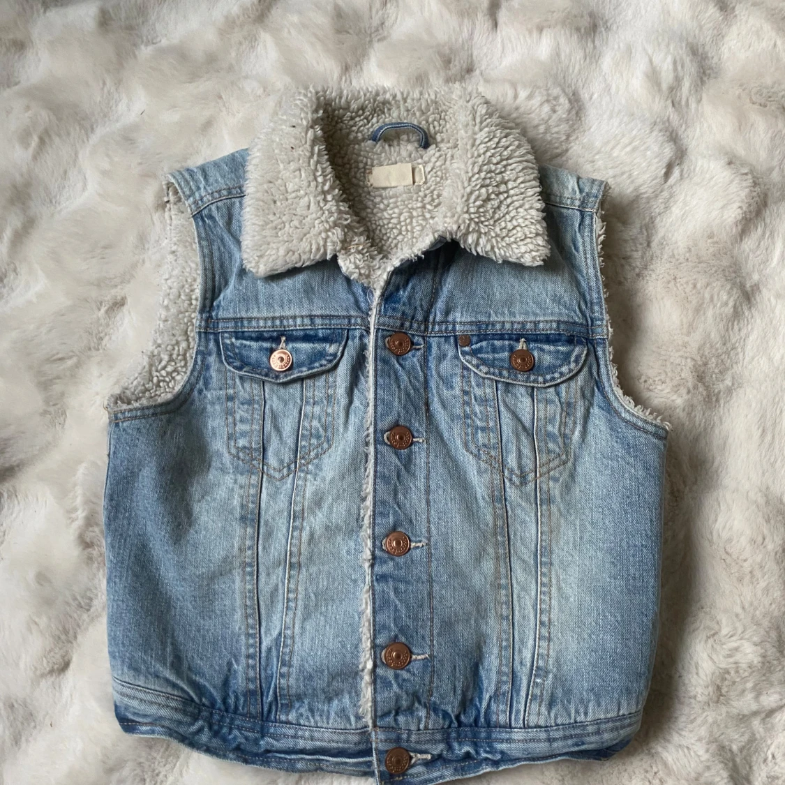 Säljer en ljusblå jeansväst från &Jacket med mjukt vitt fuskpälsfoder och krage. Västen har bruna knappar framtill och två bröstfickor med lock. Perfekt för lager-på-lager och ger en cool vintagekänsla.
