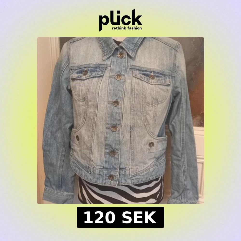 Säljer en klassisk ljusblå jeansjacka från Renim Extra med knappar framtill och två bröstfickor med lock. Jackan har lång ärm och en tidlös design som passar till många olika stilar.