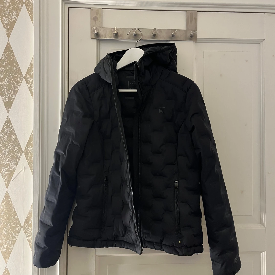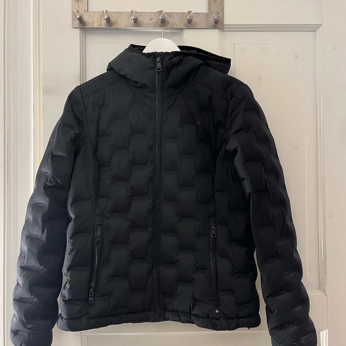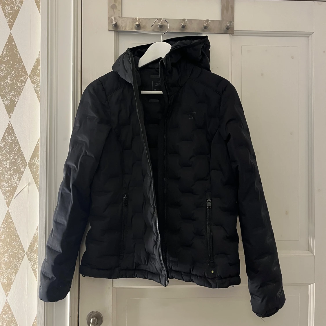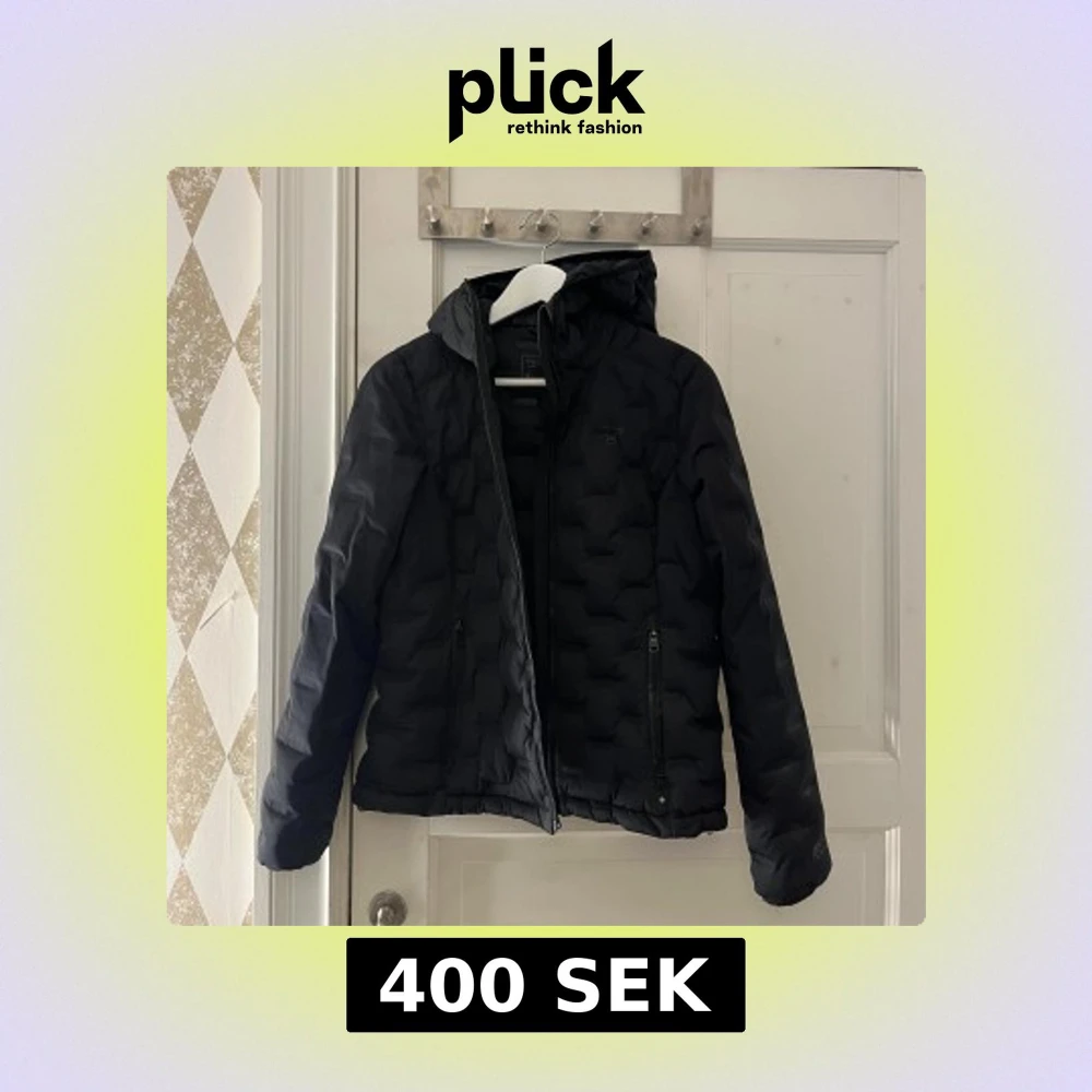 Snygg svart quiltad jacka med huva och dragkedja framtill. Jackan har långa ärmar och två praktiska fickor med dragkedja. Perfekt för kyligare dagar.