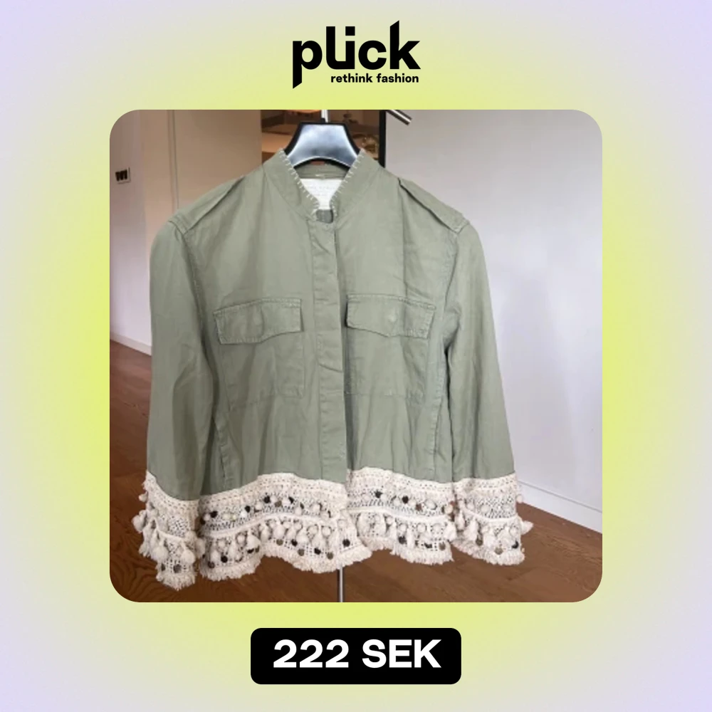 Säljer en superfin olivgrön jacka från Zara Woman. Den har unika spetsdetaljer och fransar längst ner som ger en bohemisk look. Jackan är bra för höst och vår, normal passform. Den är tillverkad i ett mjukt bomullsmaterial . Två fickor
