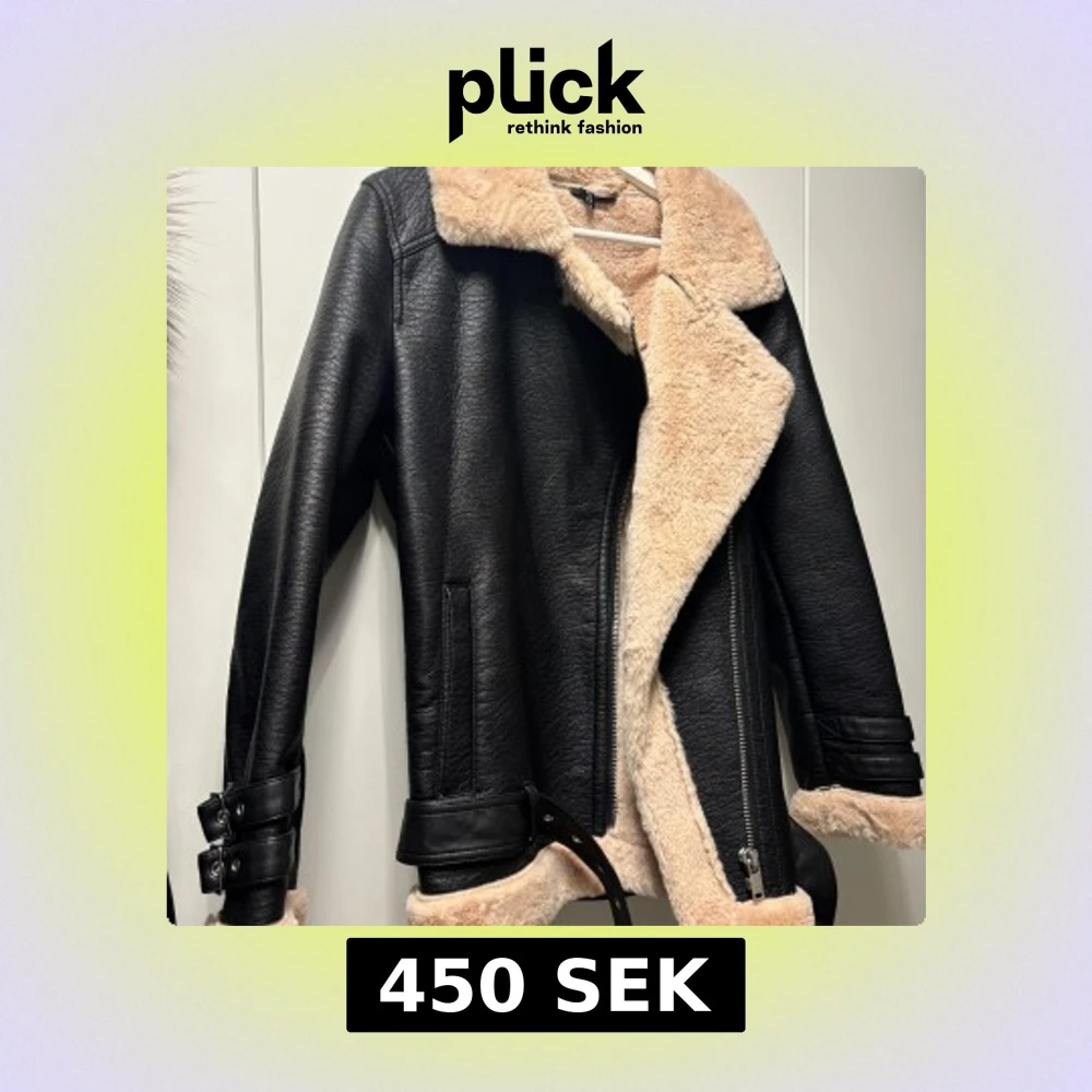 Snygg svart skinnjacka med mjukt beige pälsfoder. Jackan har en asymmetrisk dragkedja och bältdetaljer vid ärmslut och midja. Perfekt för kyligare dagar med sin stilrena design och varma foder.