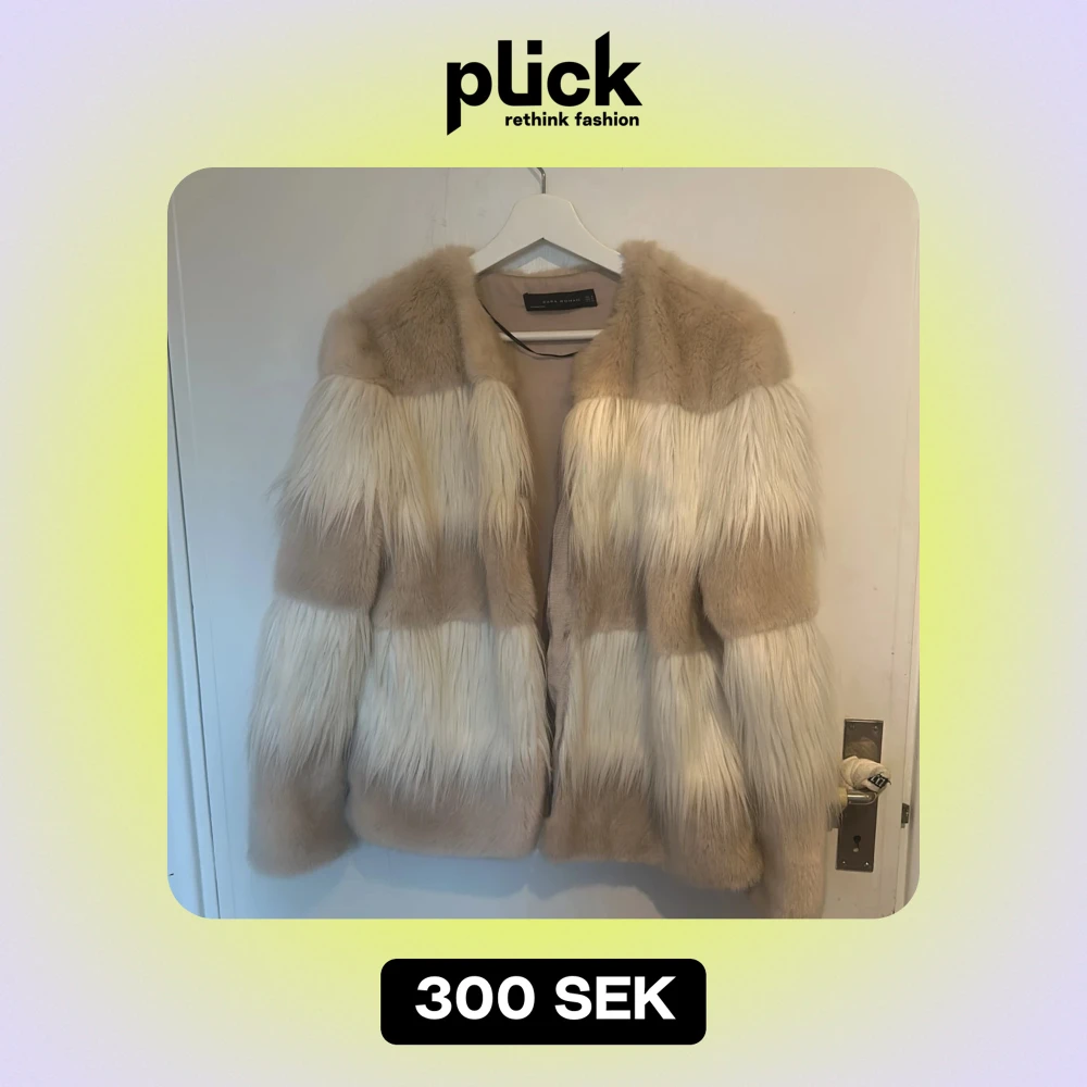 Säljer en superfin beige och vit pälsjacka från Zara Woman. Jackan har ett randigt mönster med långa ärmar och är perfekt för att hålla sig varm och stilren under kyliga dagar. Den är i mycket bra skick och passar perfekt för höst och vinter.