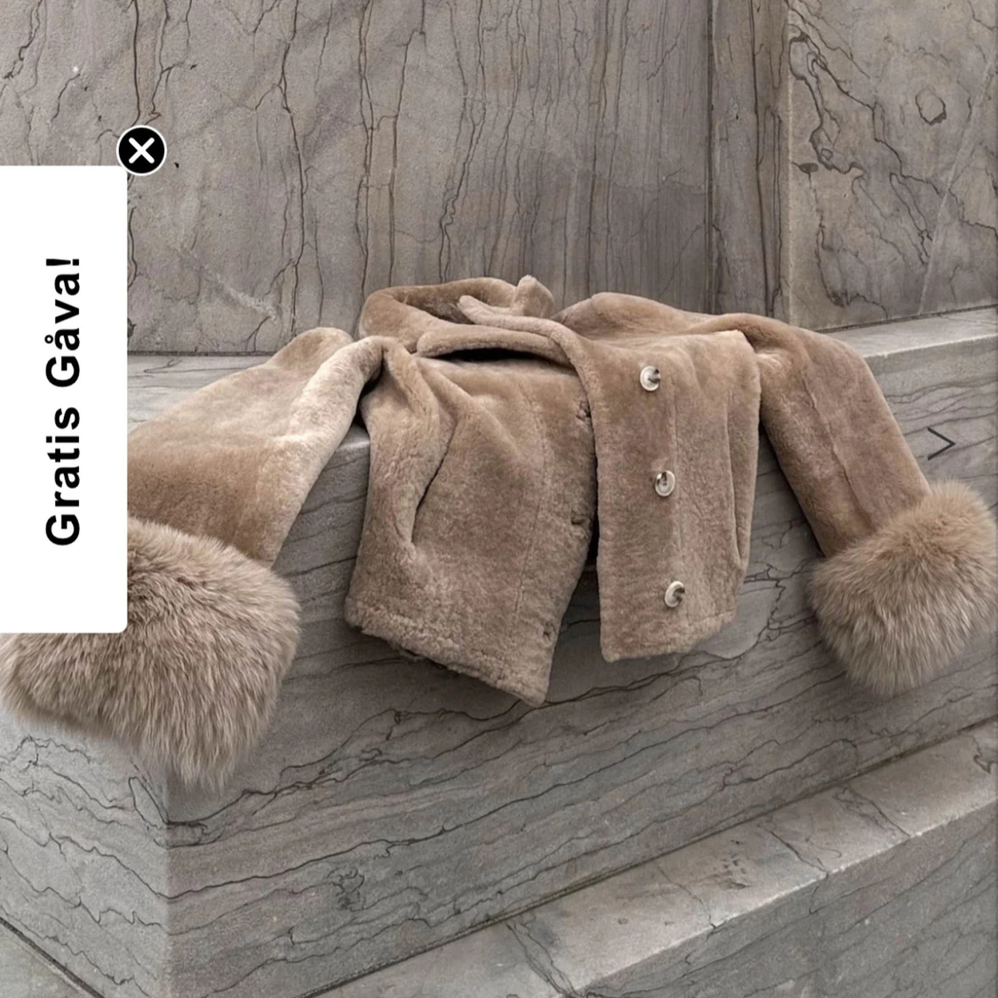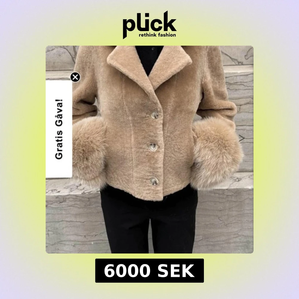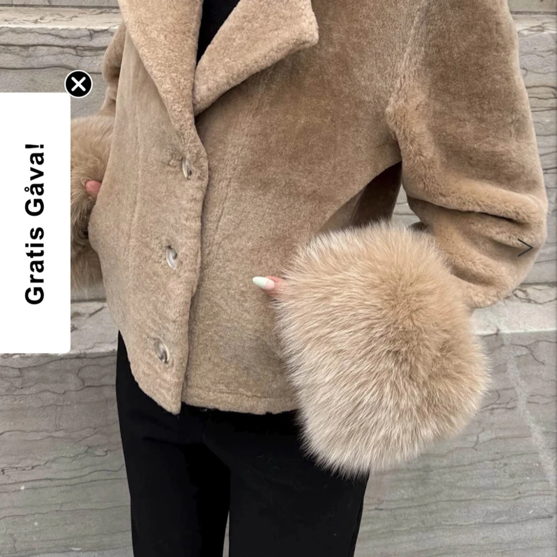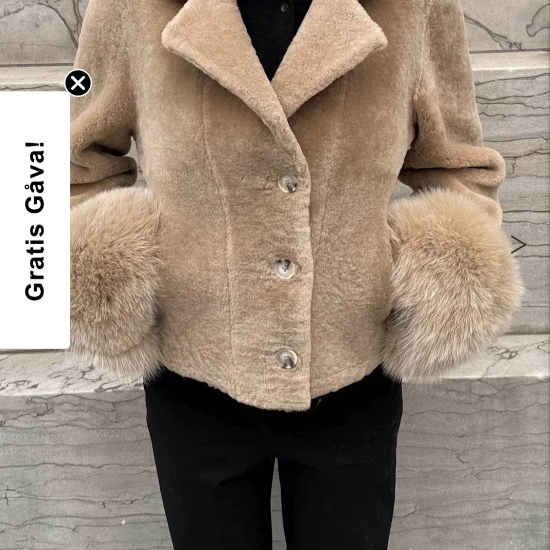 Snygg beige pälsjacka med stora fluffiga ärmslut och knappar framtill. Knappt använd så som ny. storlek s/m