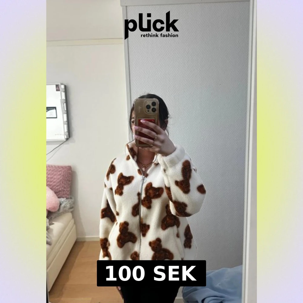 Supermysig teddyjacka i vitt med bruna nallar över hela. Jackan har dragkedja framtill, hög krage och en loose passform. Perfekt för dig som vill ha något gulligt och trendigt i garderoben. Passar även i storlek från XXS-S
