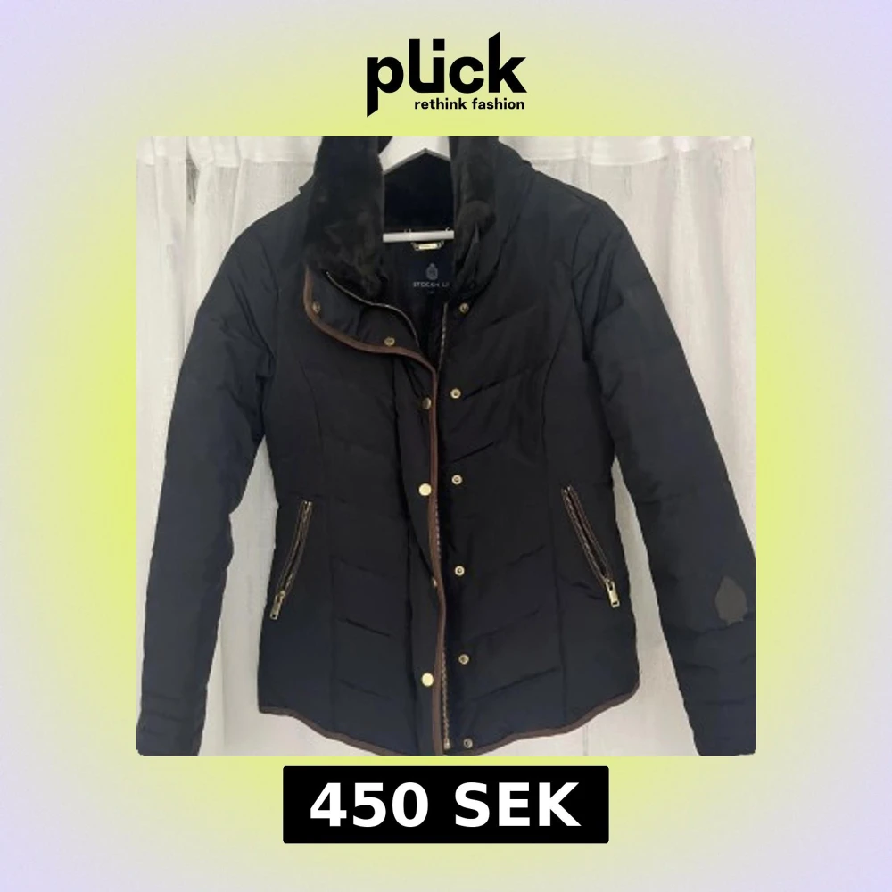 Snygg svart quiltad jacka från Stockh LM med mjuk fuskpäls vid kragen och guldfärgade dragkedjor. Jackan har långa ärmar, bruna detaljer längs kanterna och två fickor med dragkedja framtill. Perfekt för kyliga dagar.