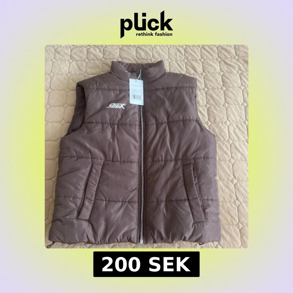 Säljer en brun dunväst med hög krage och dragkedja framtill. Västen har två fickor på sidorna och en stilren design med en logga på bröstet.