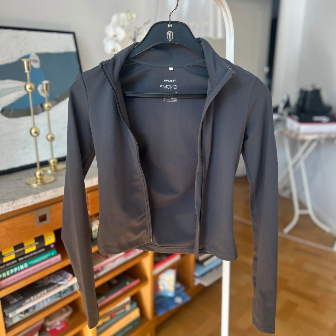 Snygg grå jacka från H&M Move i ett mjukt och stretchigt material. Jackan har en dragkedja framtill och långa ärmar, perfekt för en aktiv livsstil. Tillverkad av polyester och elastan för en bekväm passform.