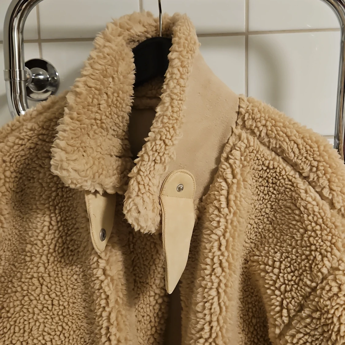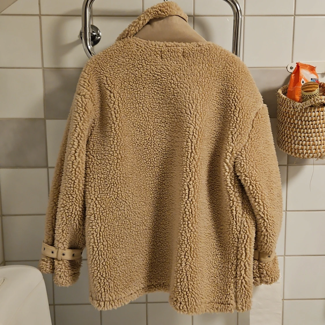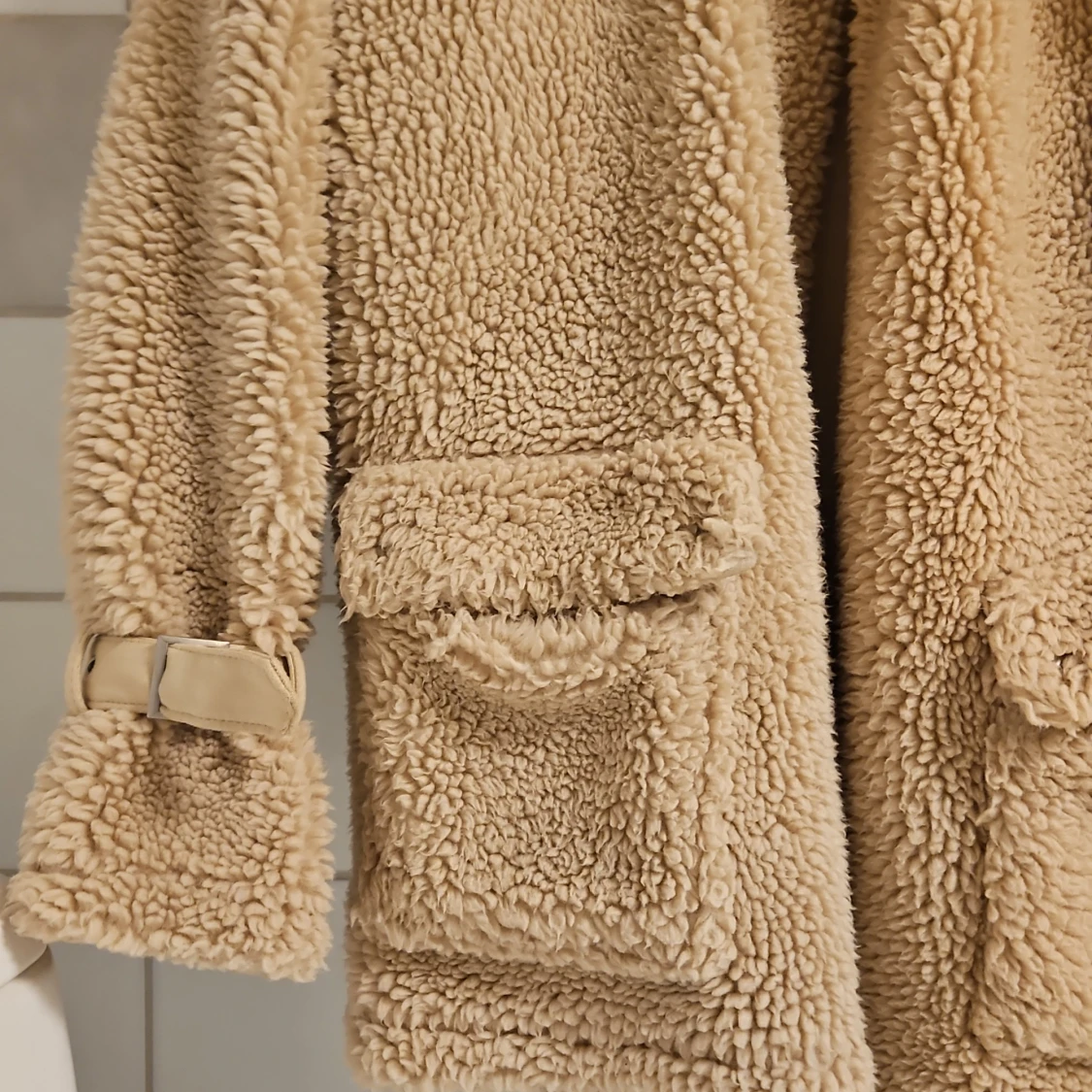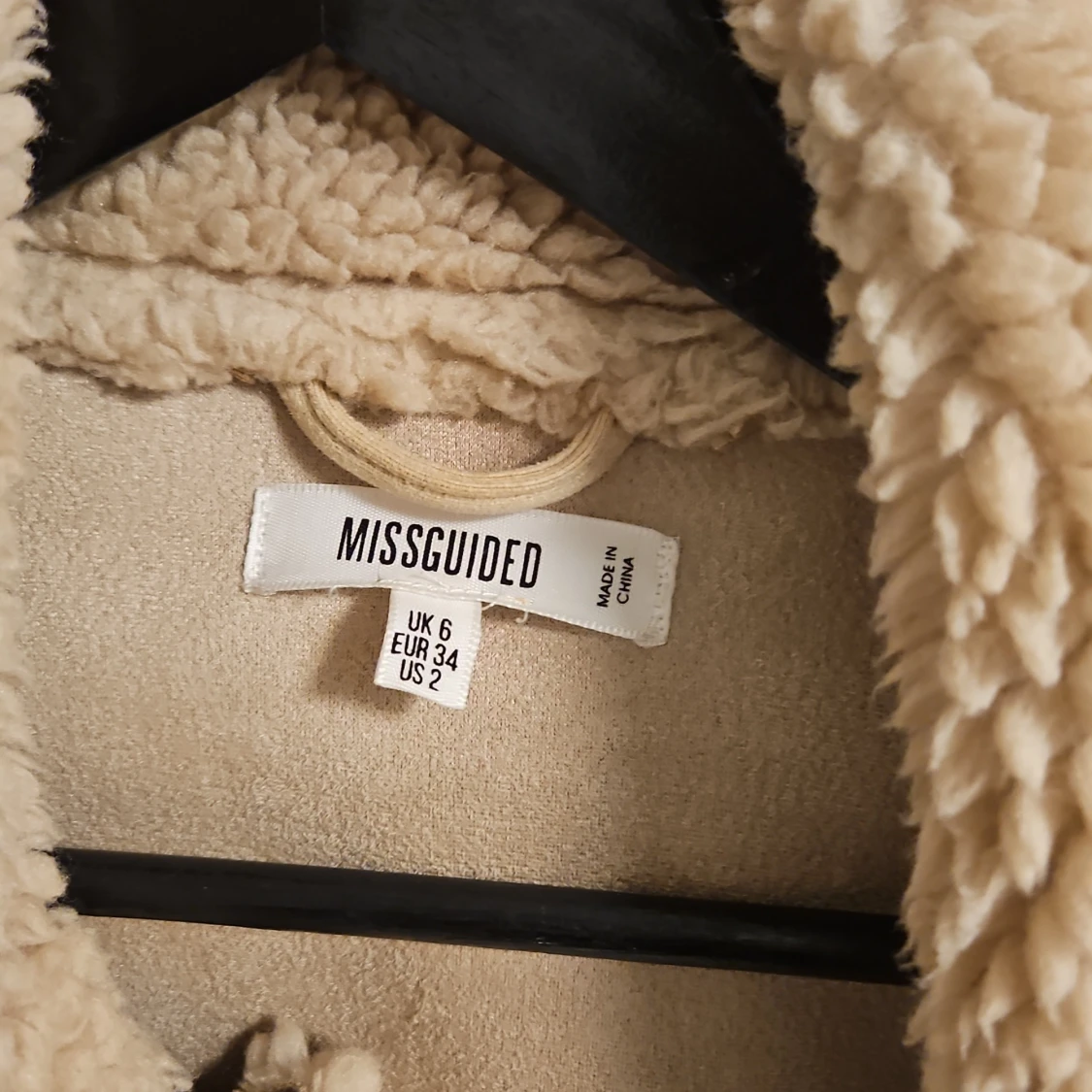 Beige teddyjacka / sherpajacka från Missguided. Jackan har långa ärmar och fickor framtill. Den stängs med drsgkedjs och har en krage som går att knäppa igen. Stpr i storlek så passar även strlk 36.