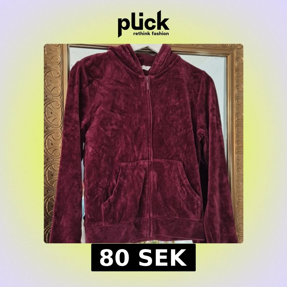 Mysig vinröd hoodie i velour med dragkedja framtill och två fickor.