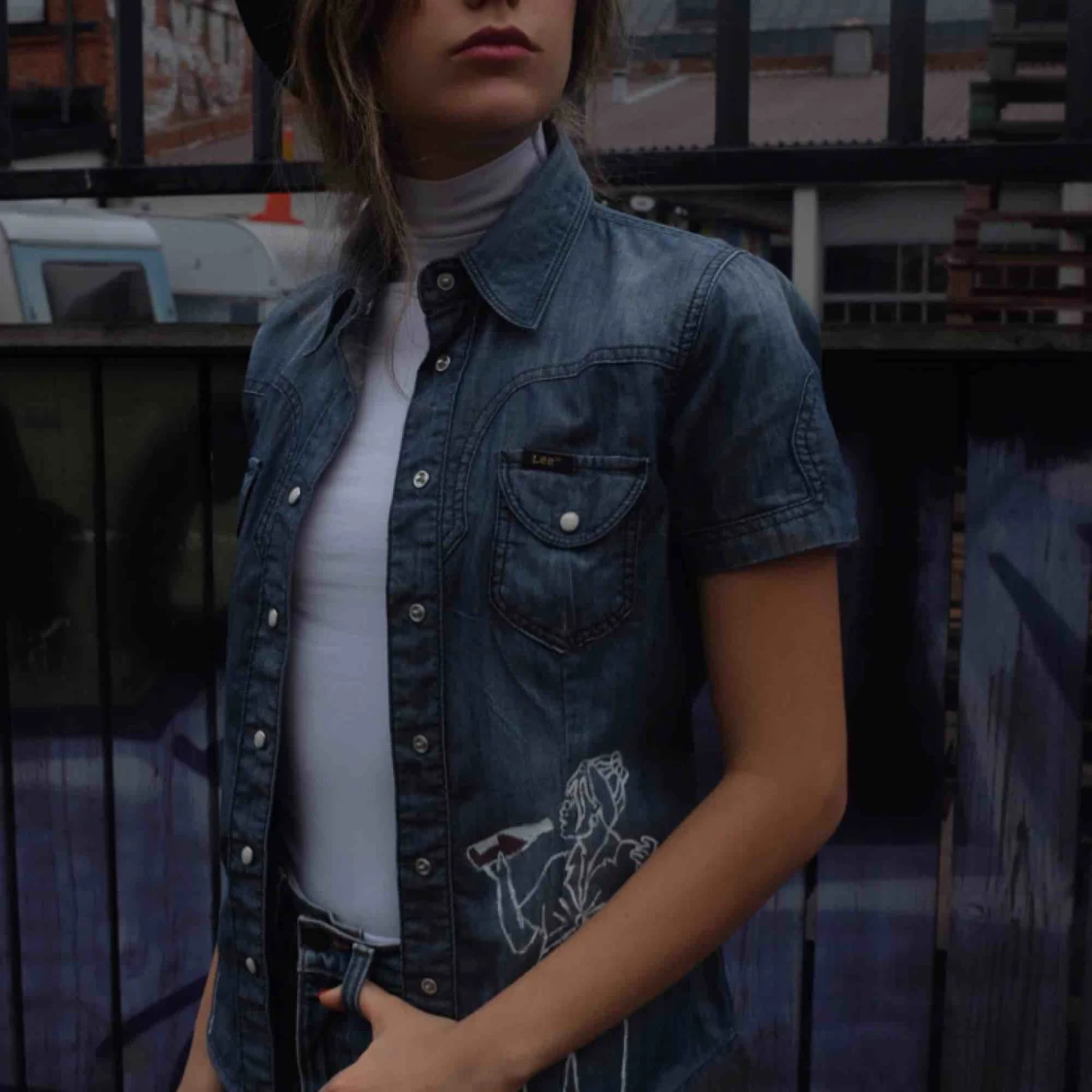 Vintage jeans skjorta från LEE med handmålad design gjord av deminkollekrivet. Passar S-XS