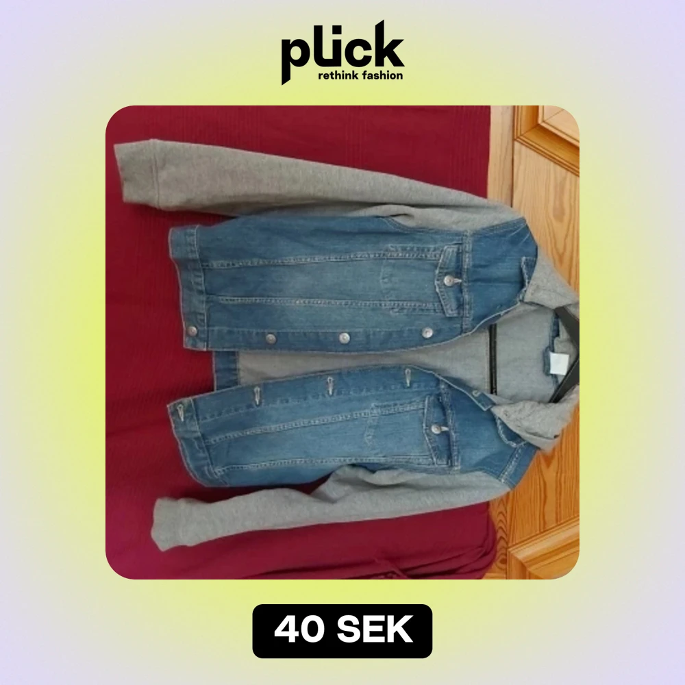 Jeansjacka med luva och ärmar i tröjtyg. Luvan går att ta av.
