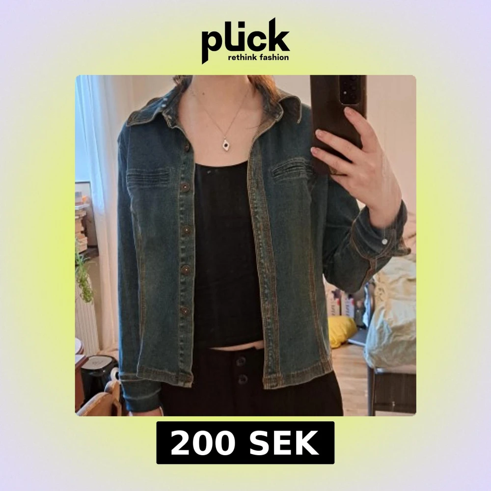 Blå jeansjacka med snygga kontrastsömmar och knappar framtill. Jackan har även två "fejk" fickor på framsidan över bröstet. Om ni vill se fler bilder eller har en fråga är det bara att höra av sig <3