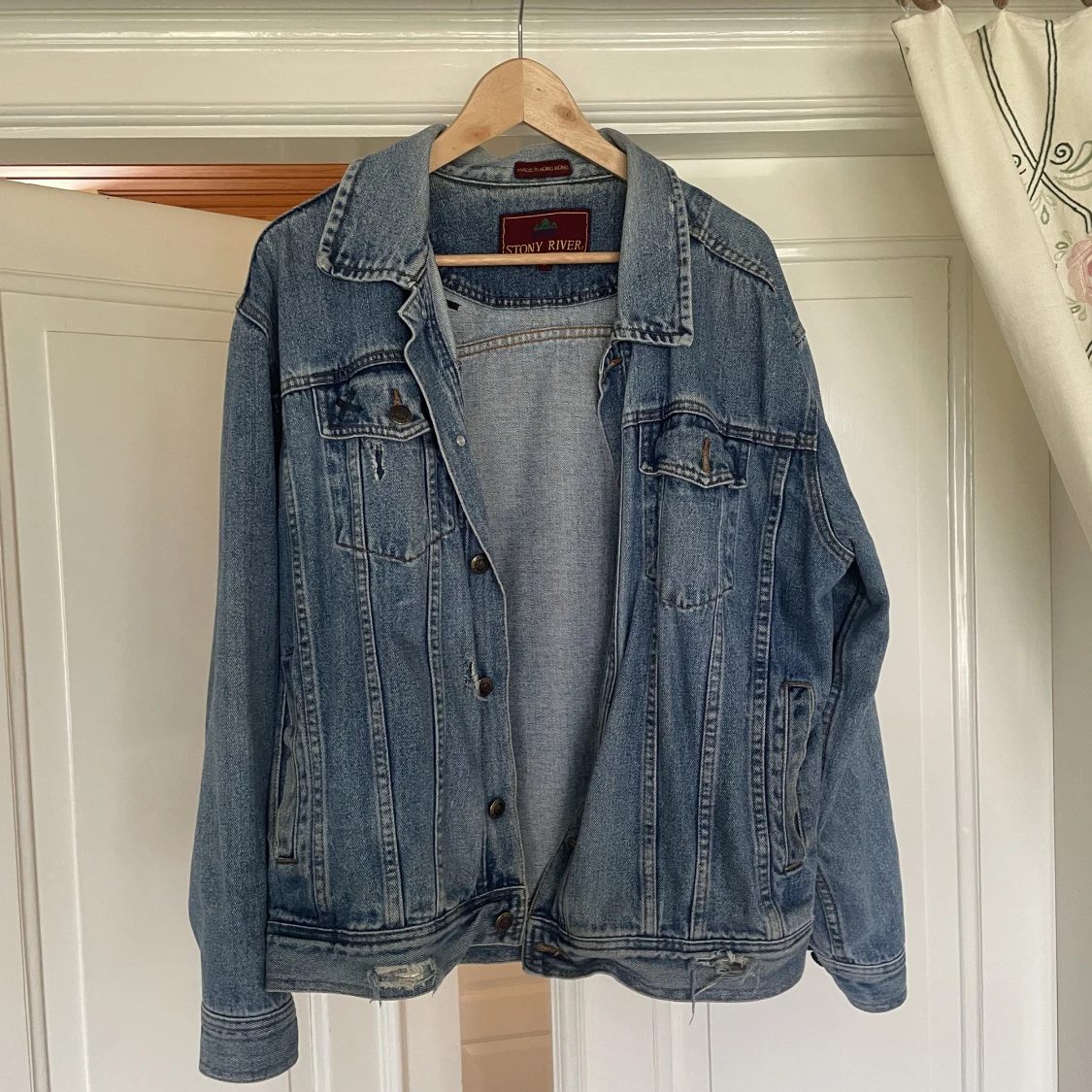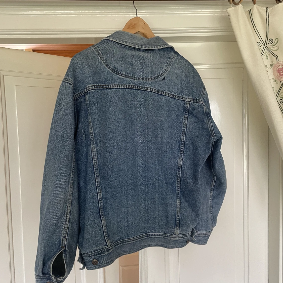 Denim trucker-jacka som thriftades i usa. Inte perkeft condition och har ett X märketat på bröstfickan för nån anledning. Passformen är pösig men skulle ändå säga size M.