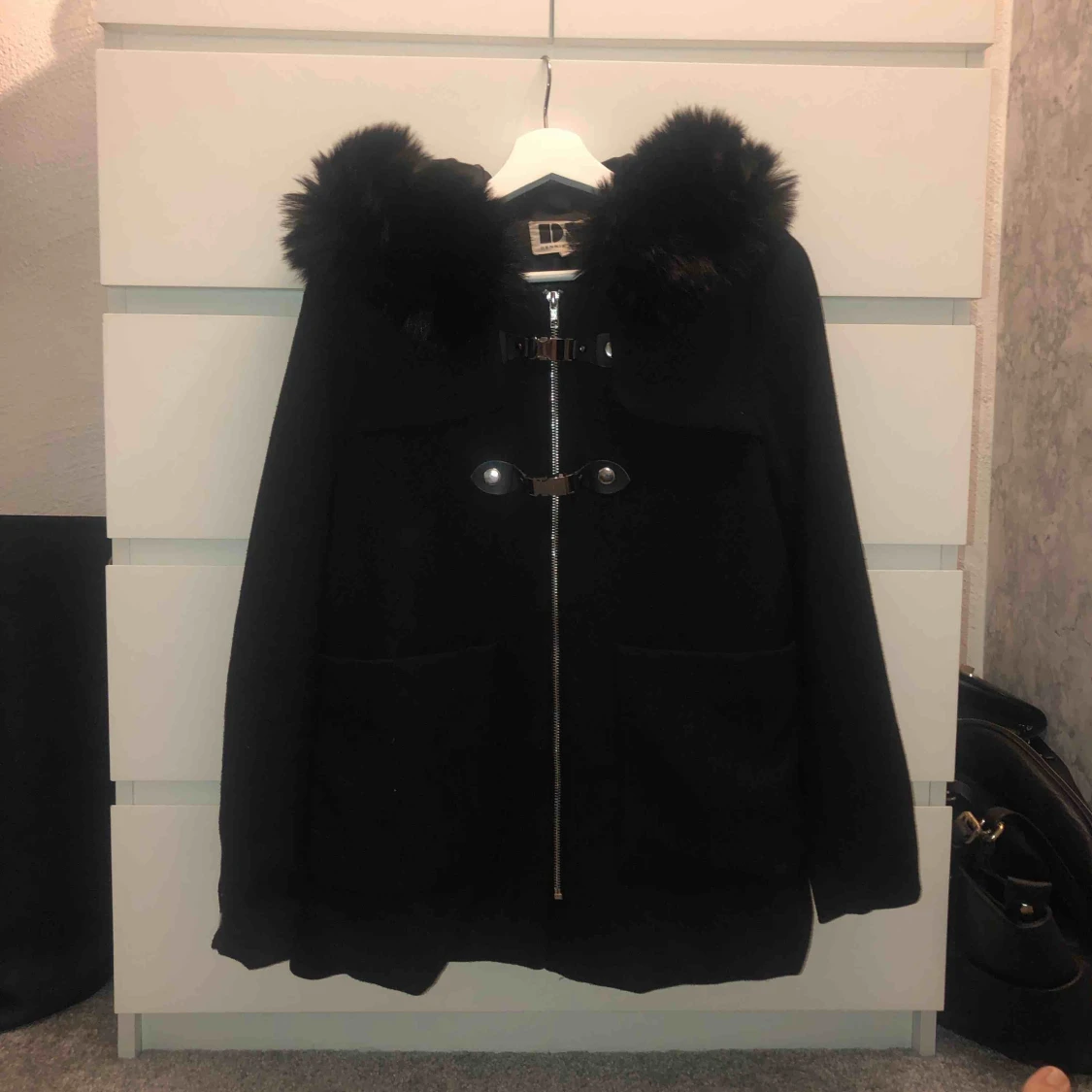 En fin höst/vinter kappa från Dennis Maglic. Den slutar precis nedanför rumpan på mig som är 1,64 lång. Fuskpäls på luvan. Man stänger med dragkedja och så finns det 2 spännen upp till. Nypris: 1899kr. Köparen står för frakt.