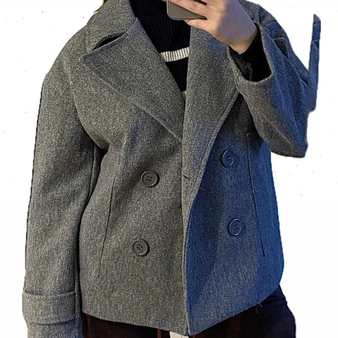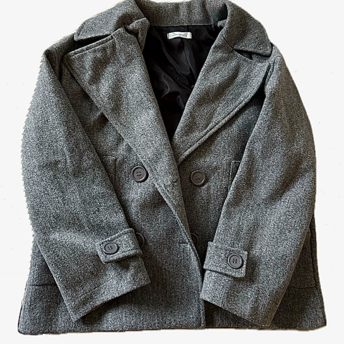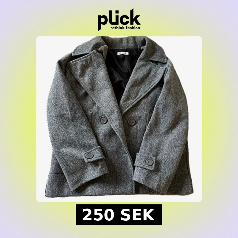 Snygg grå kappa från design by si med dubbelknäppning och stora knappar. Perfekt för kyligare dagar. Köpte för 600 men säljer för 250. Inga defekter.