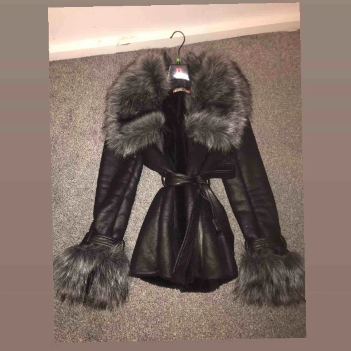 Denna jackan köpte ja för 2000kr och har använt den en gång (priset kan diskuteras genom snabbaffär). De är fake päls, Det är storlek M, Den har en dragkedja, den är varm inuti, Köpte den från diabless, Kan skicka flera bilder om du är intresserad☺️