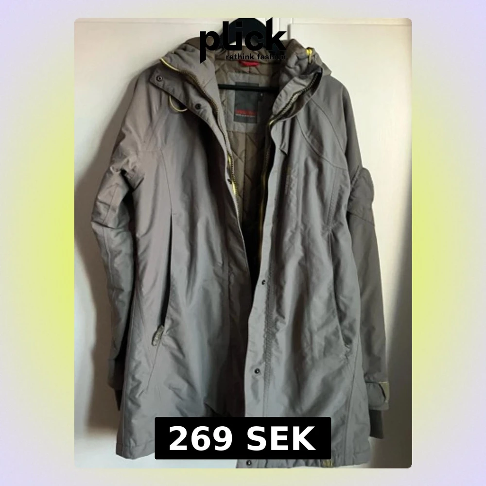Säljer en grå parkajacka från Didriksons med quiltat foder och huva. Jackan har gul dragkedja, praktiska fickor och snygga detaljer. Perfekt för kyliga dagar och har en längre passform som ger extra skydd mot väder och vind.