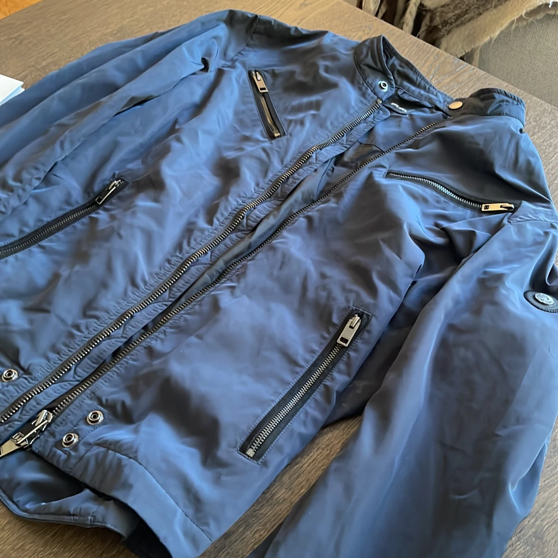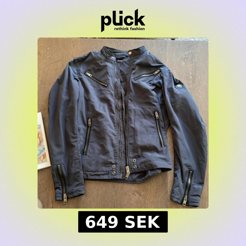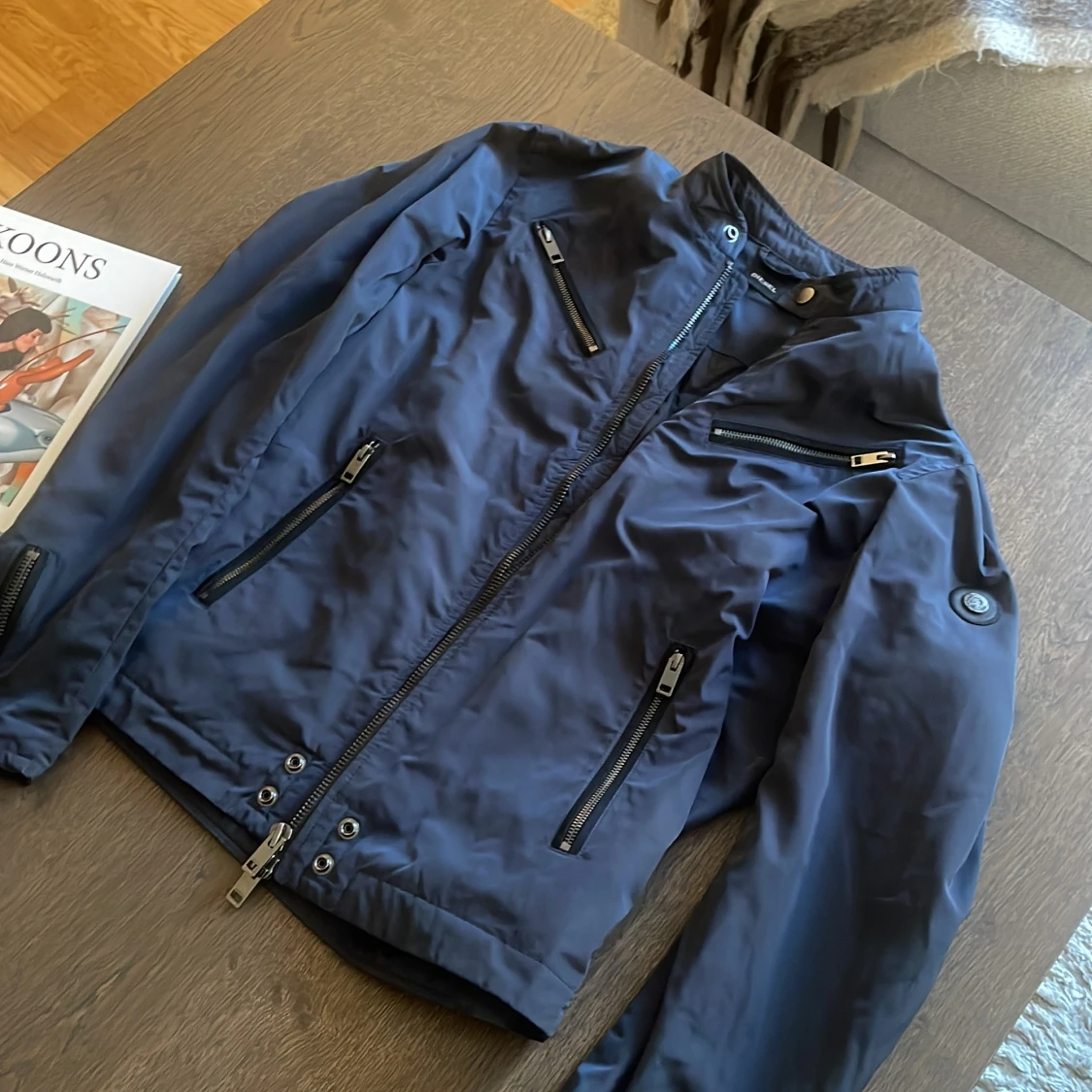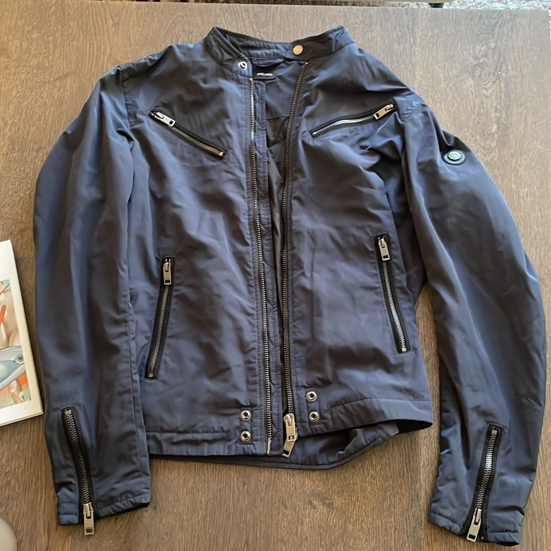 Mörkblå bomberjacka från Diesel med flera dragkedjor på bröstet, ärmarna och sidorna. Jackan har en cool ståkrage med knapp och ett Diesel-märke på ärmen.