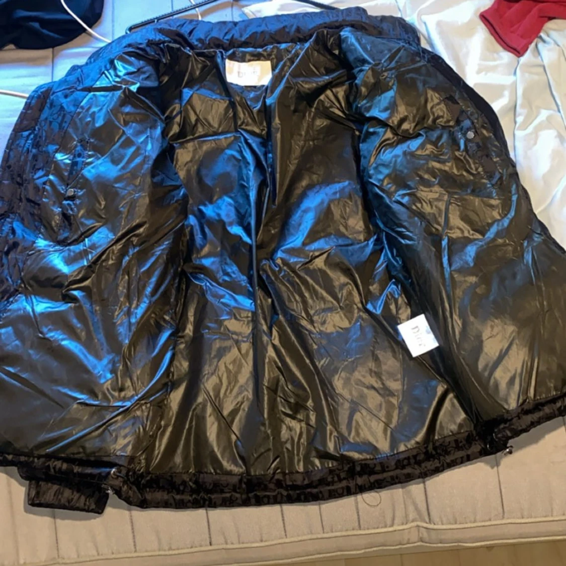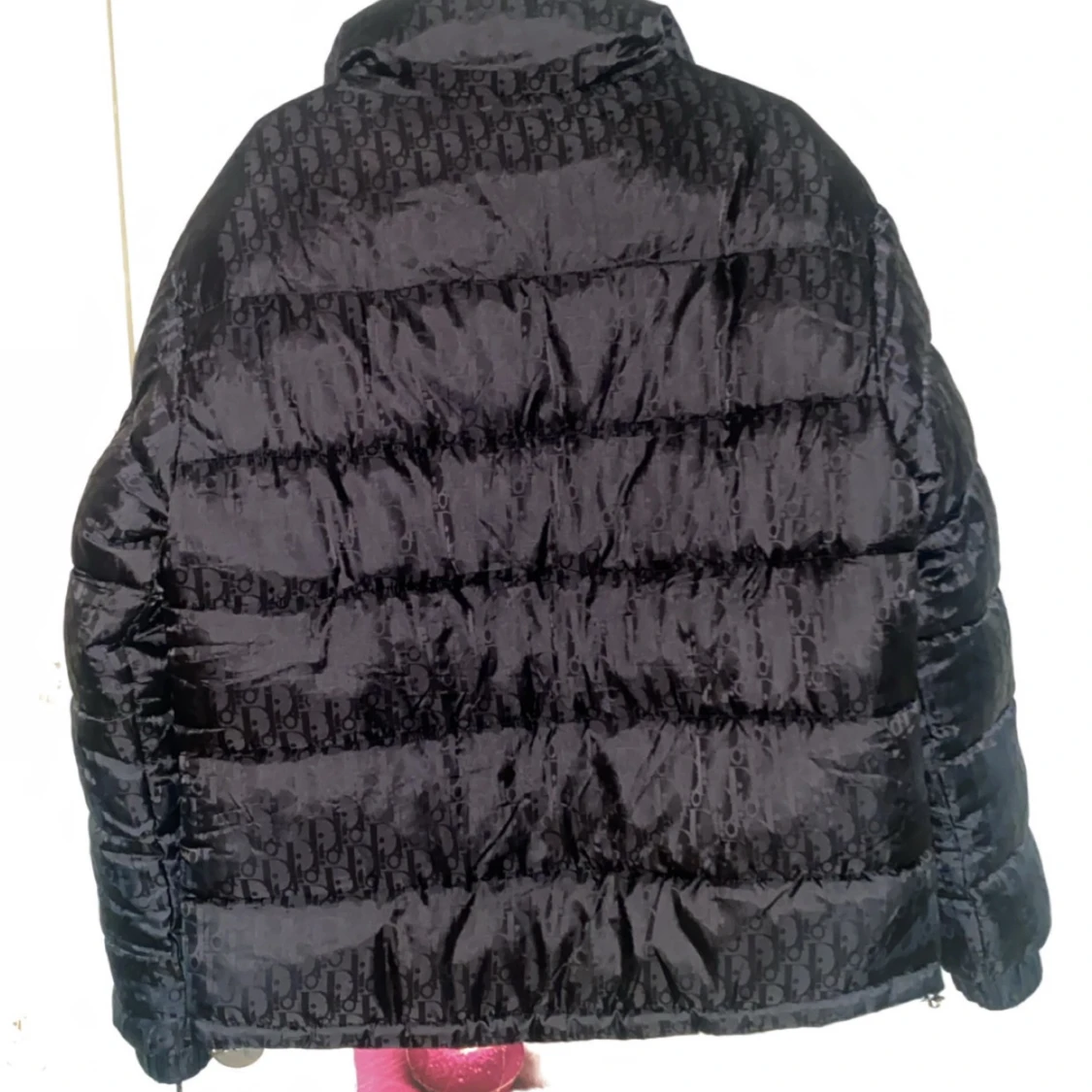 Snygg svart pufferjacka från Dior med diskret monogrammönster över hela jackan. Jackan har dragkedja framtill, hög krage och två fickor. Materialet är glansigt och känns lyxigt, perfekt för kalla dagar när du vill sticka ut med stil.