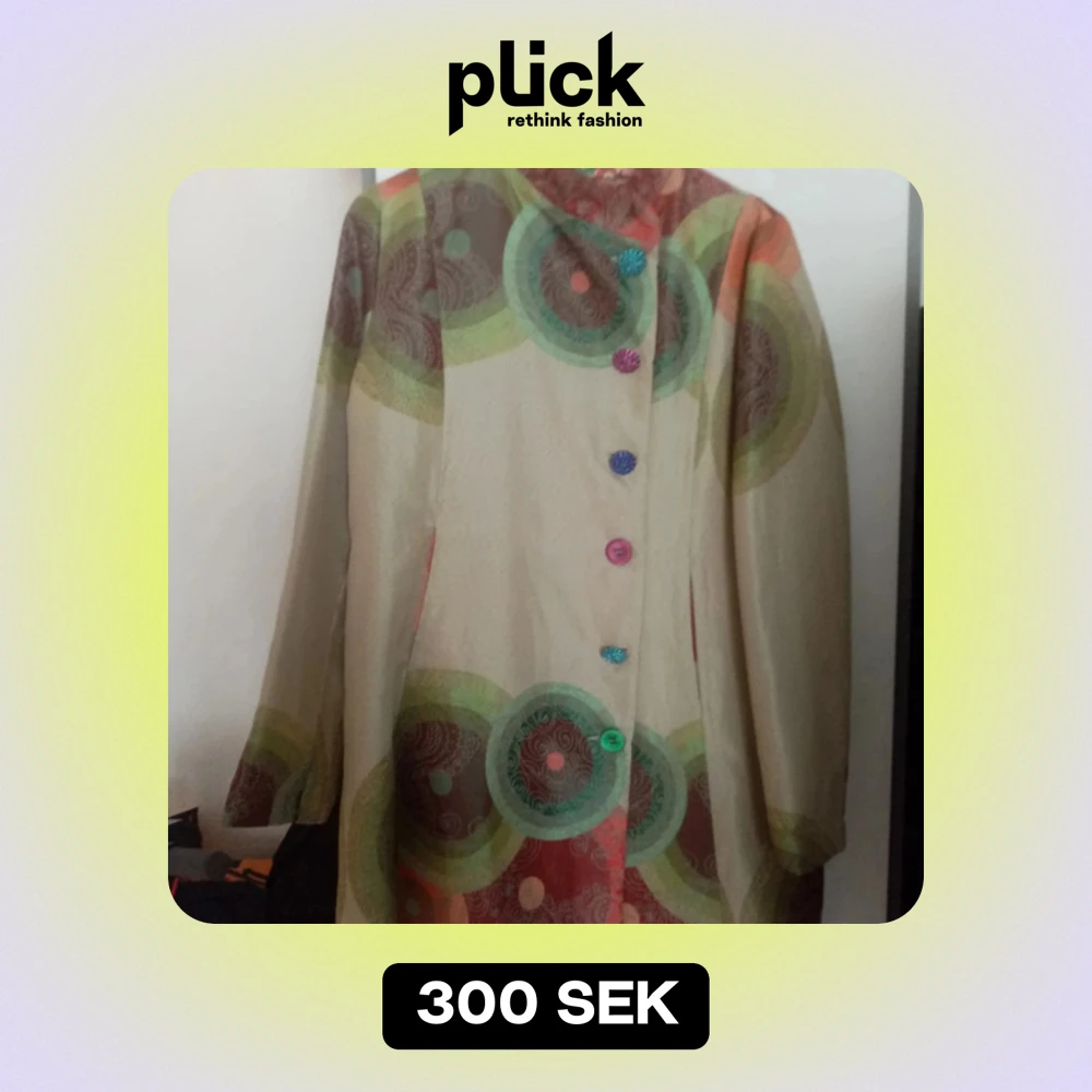 Säljer en unik och färgglad kappa med ett coolt cirkelmönster i grönt, orange och brunt. Den har långa ärmar och knäpps med färgglada knappar framtill. Perfekt för att liva upp höst- och vårgarderoben!