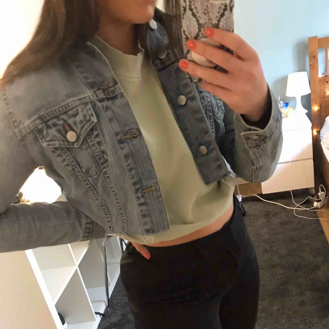 Ljusblå lite croppad jeansjacka i fin tvätt. Strl M men passar mer som S. Säljs i gott skick!