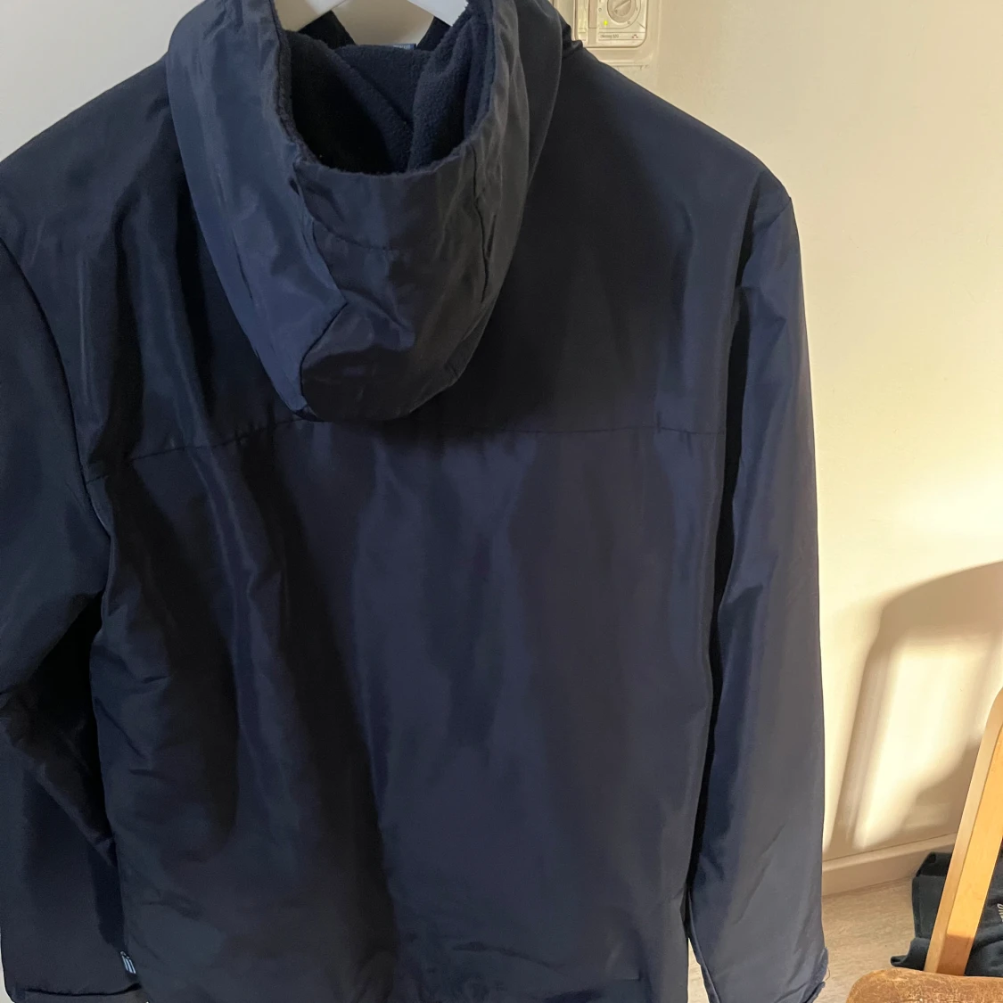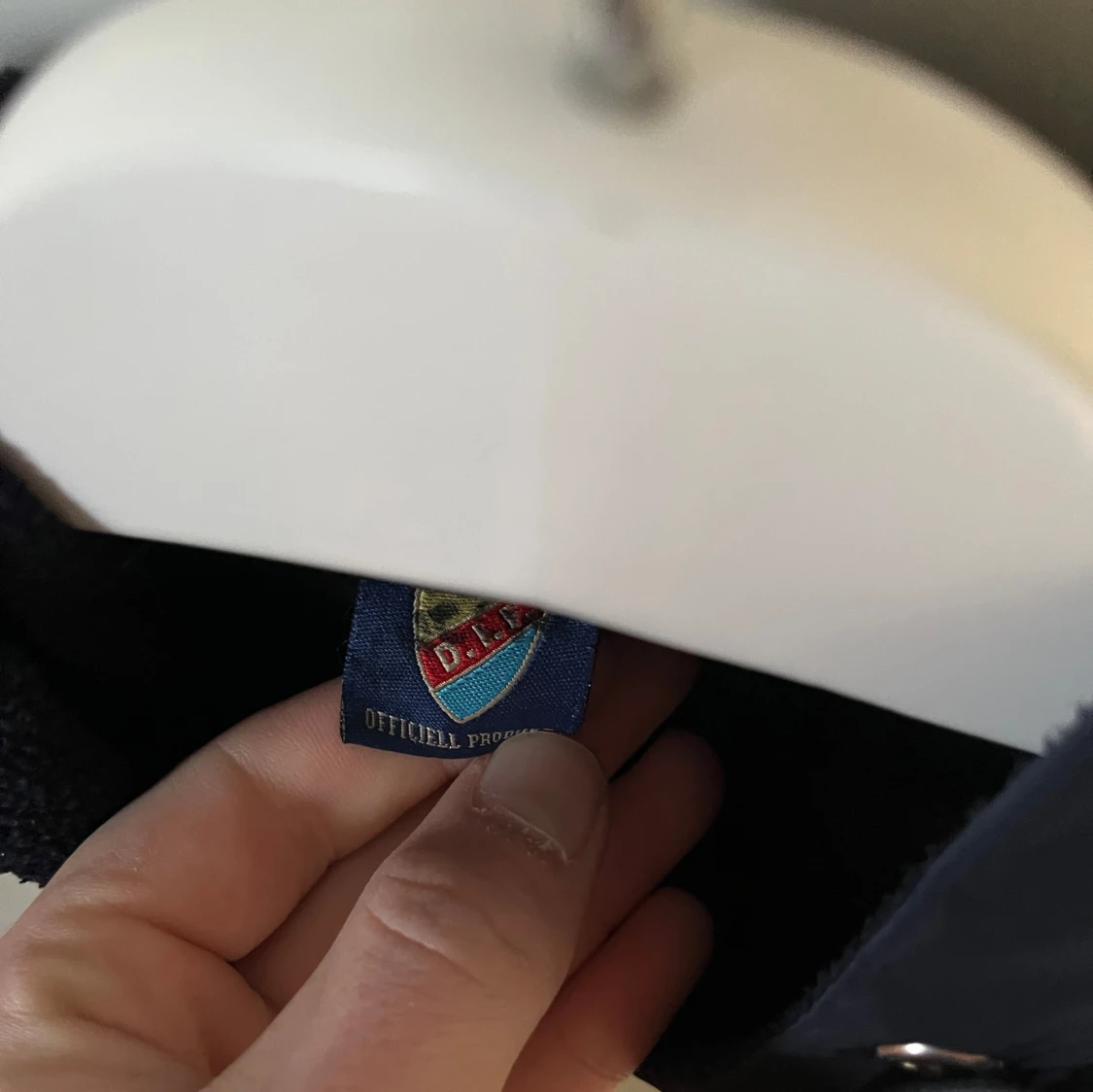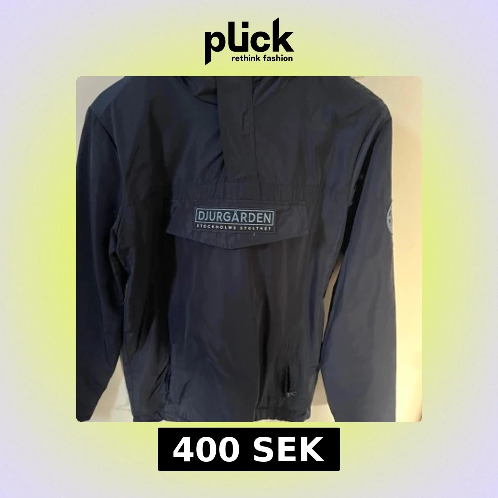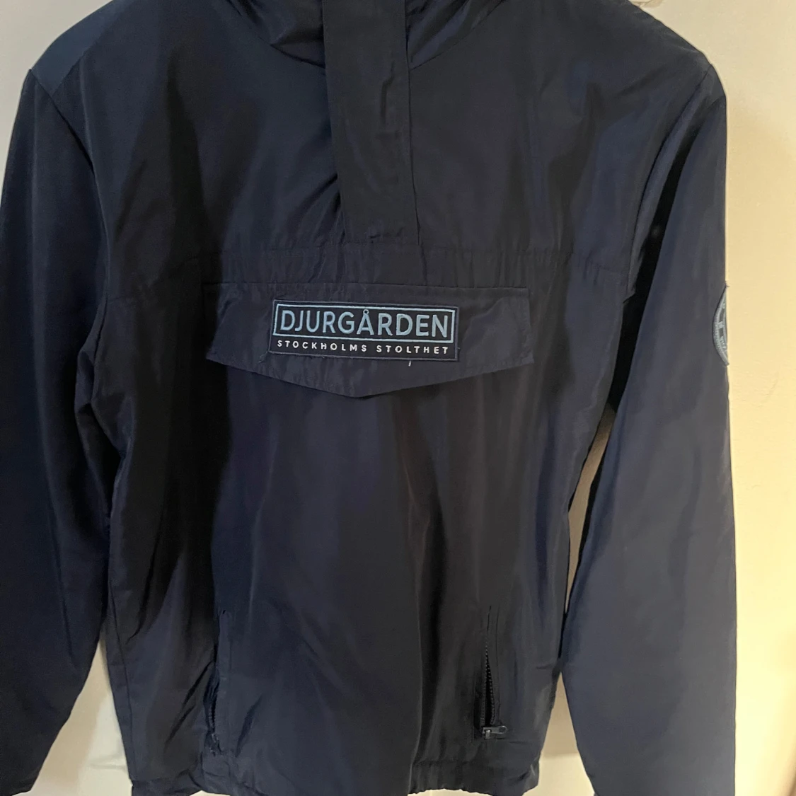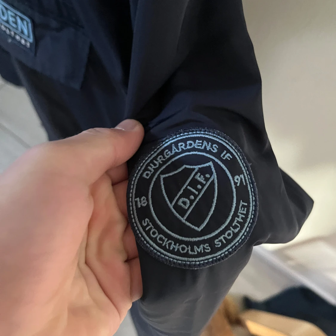 Mörkblå vindjacka från Djurgårdens IF med broderad DIF-logga på ärmen och stor ficka framtill med Djurgården-tryck. Jackan har huva, dragkedjor på fickorna och är tillverkad i lätt polyester. Perfekt för dig som vill visa vilket lag du håller på.