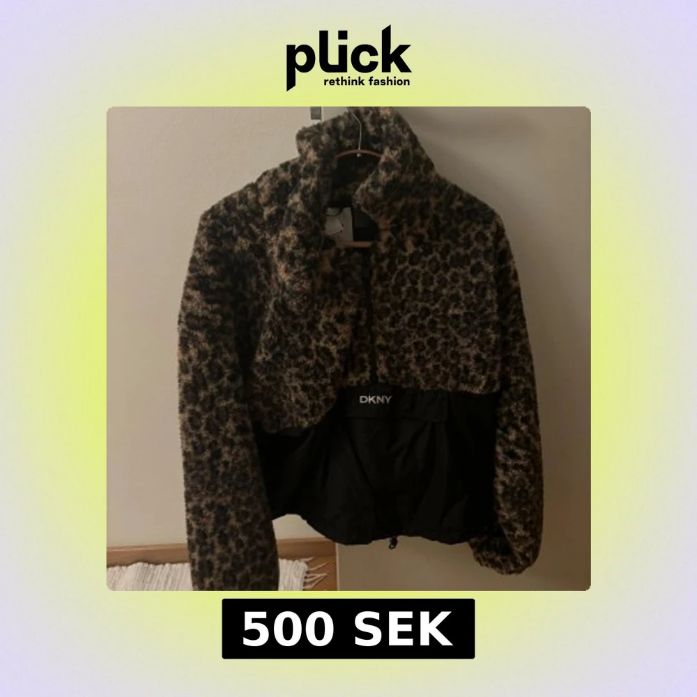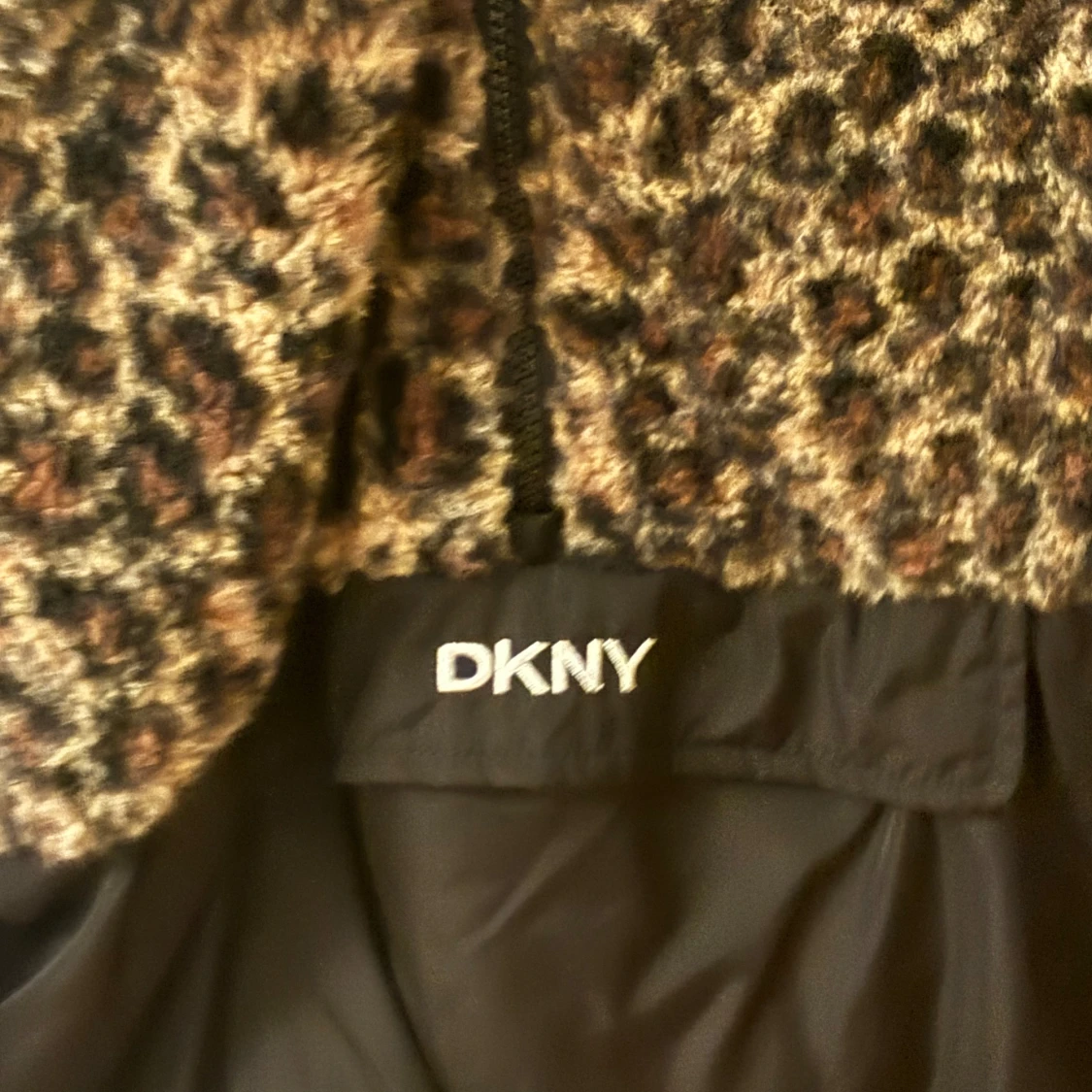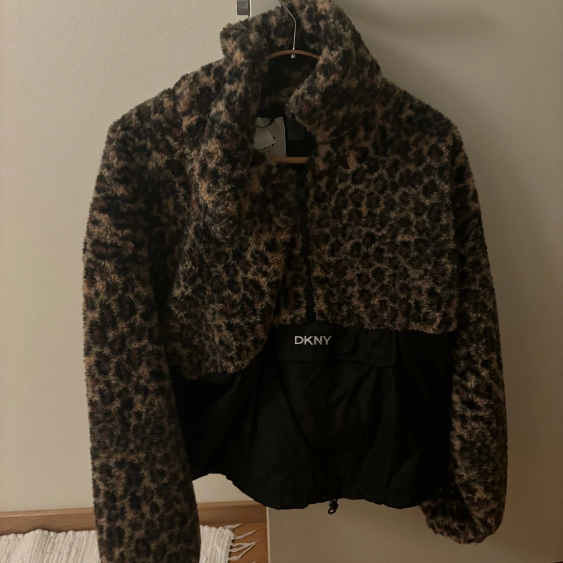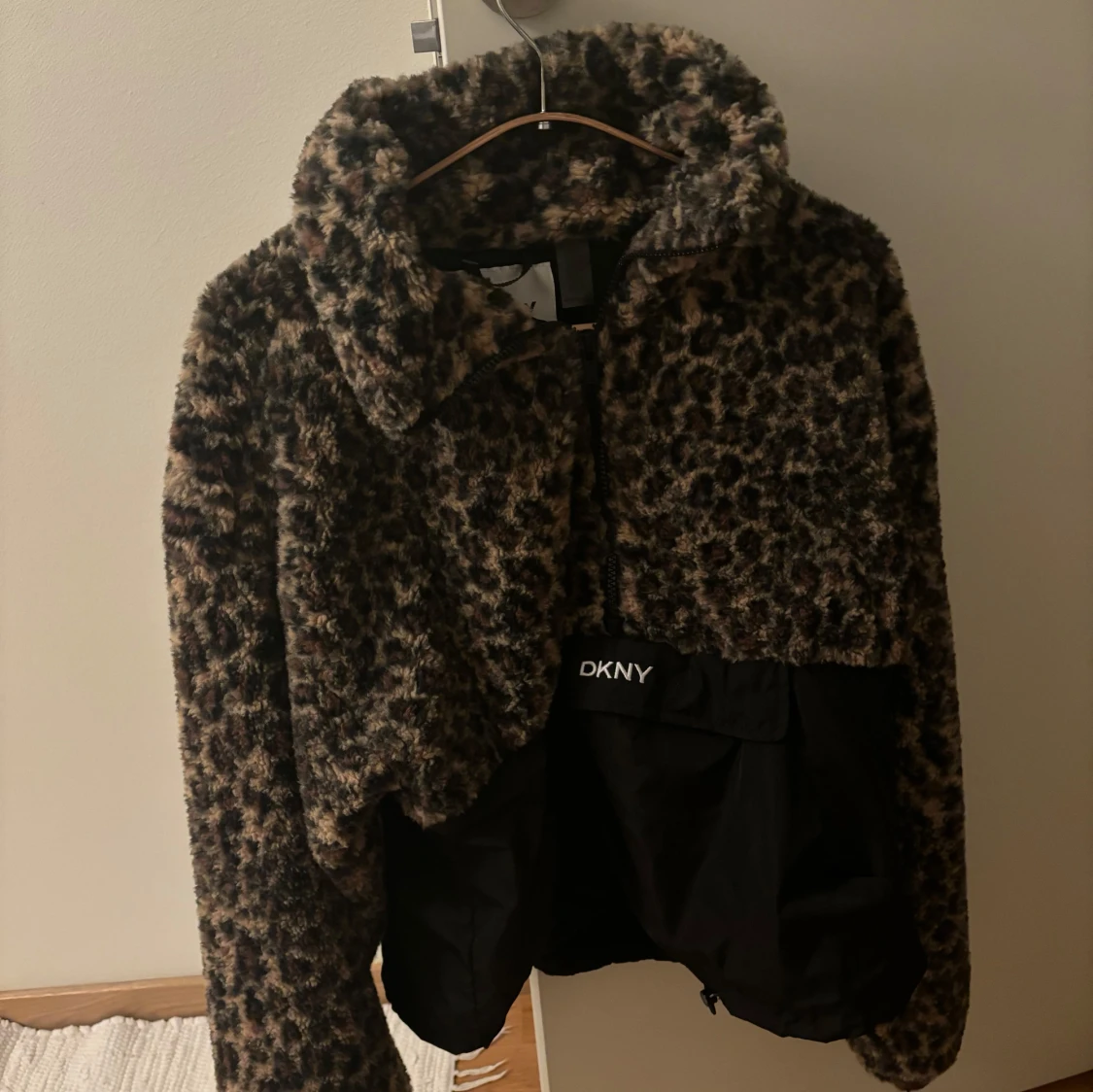 Säljer en snygg leopardmönstrad teddyjacka från DKNY. Jackan har en dragkedja framtill och är perfekt för att hålla sig varm och trendig. Den har en croppad passform och är långärmad.