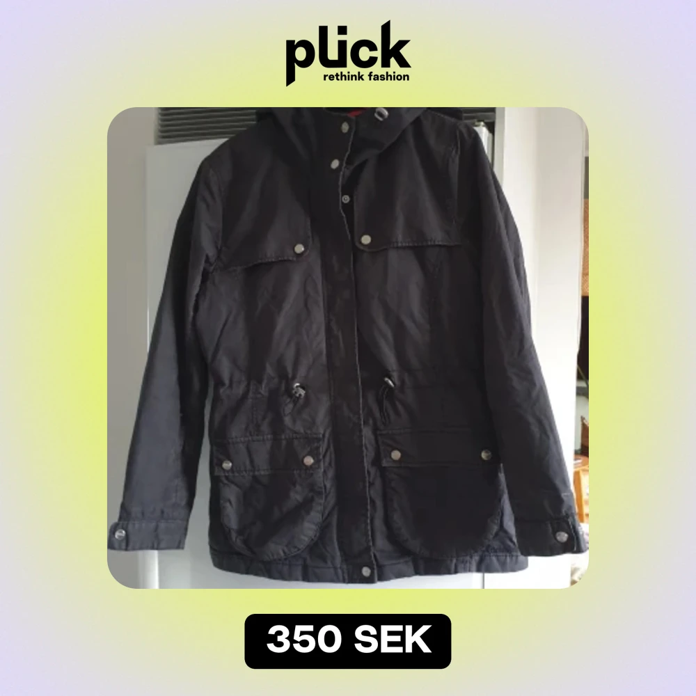 Säljer en svart jacka från Dobber i storlek medium. Den har en praktisk huva och stängs med dragkedja och knappar. Jackan har flera fickor med knappar, perfekt för höst och vår. Slitstarkt stentvättat material. Bra skick. Nypris 1299kr. Medium/40-42