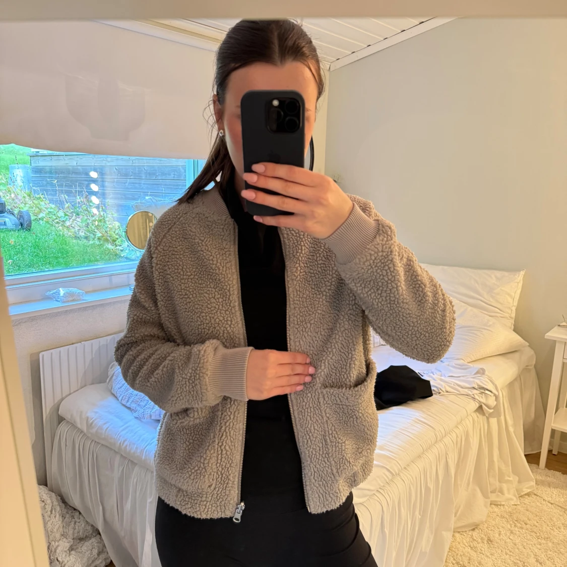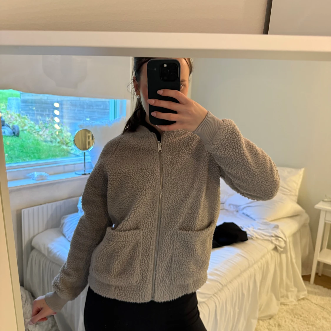 Mysig beige teddyjacka från Dobber i storlek XS. Jackan har dragkedja framtill, två stora fickor och ribbade muddar vid ärmslut och midja. Perfekt för kyliga dagar när du vill vara både varm och snygg.