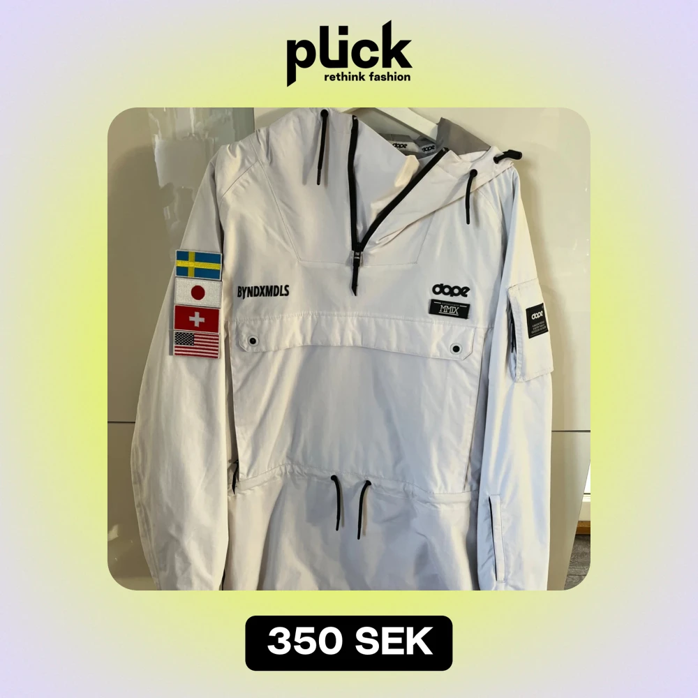 Säljer en vit vindjacka från Dope med detaljer som flaggor på ärmen och texten BYNDXMDLS. Jackan har en dragkedja framtill och en stor ficka på magen. Perfekt för skidåkning, då den har en avslappnad passform. Jackan är i mycket bra skick, endast använd en vecka på skidsemester, nypris 1500kr.