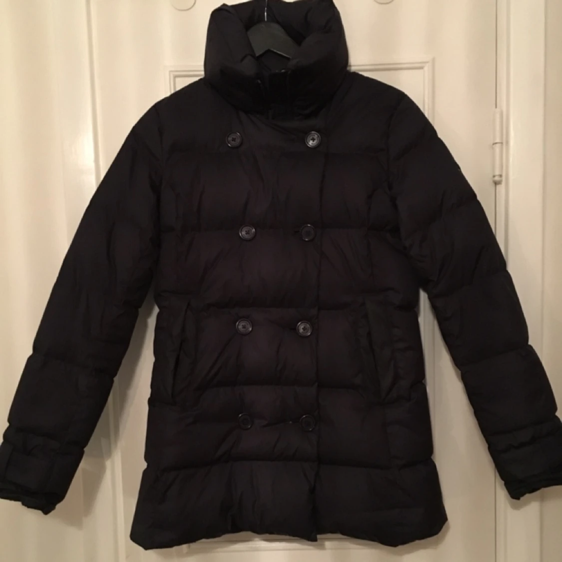 Mörkblå, nästan svart Boomerangjacka, endast använd en vinter. Figursydd, väldigt kvinnlig modell, utan luva. Storlek XS men passar lätt S också .