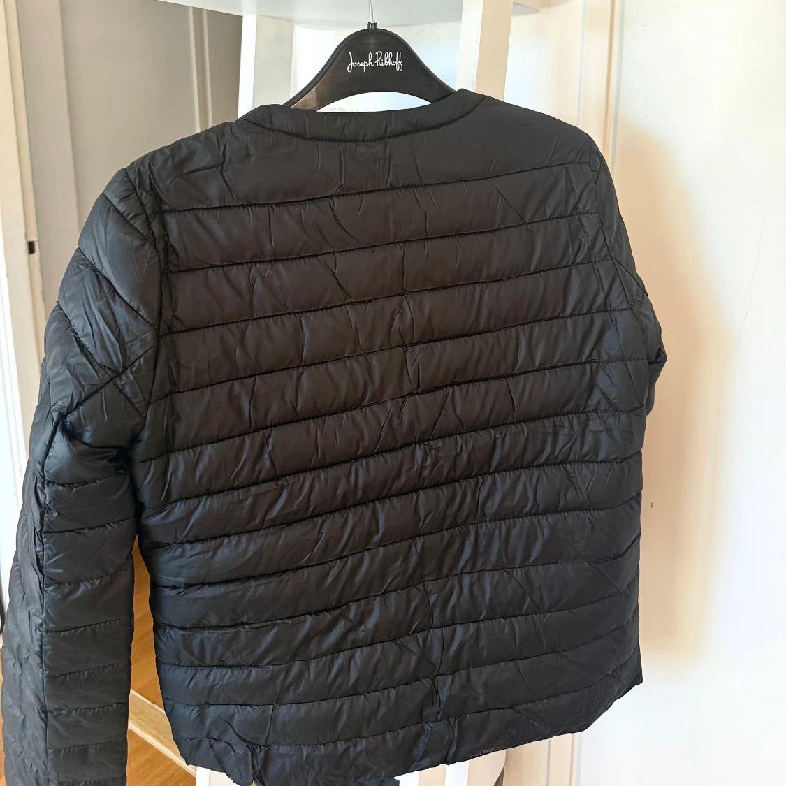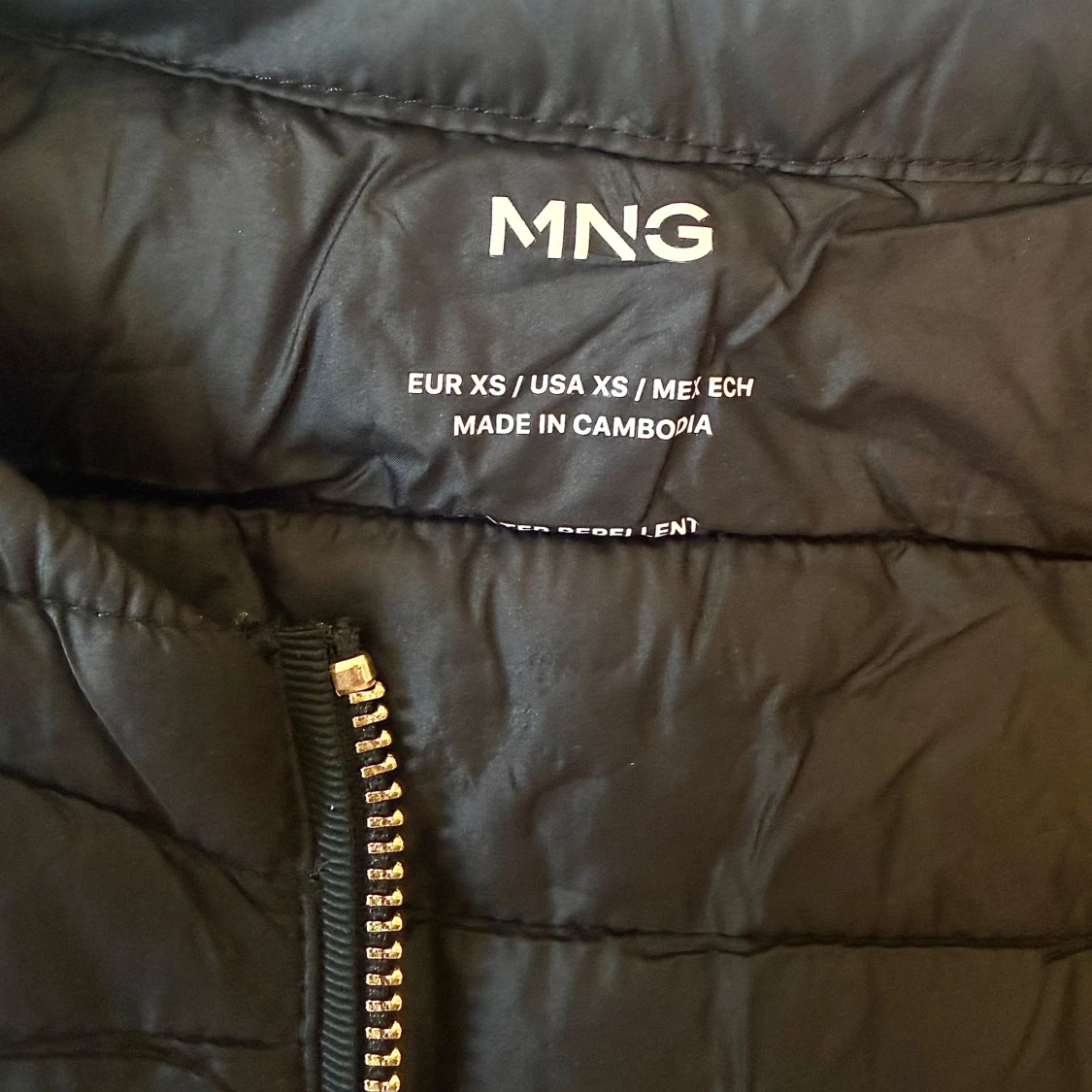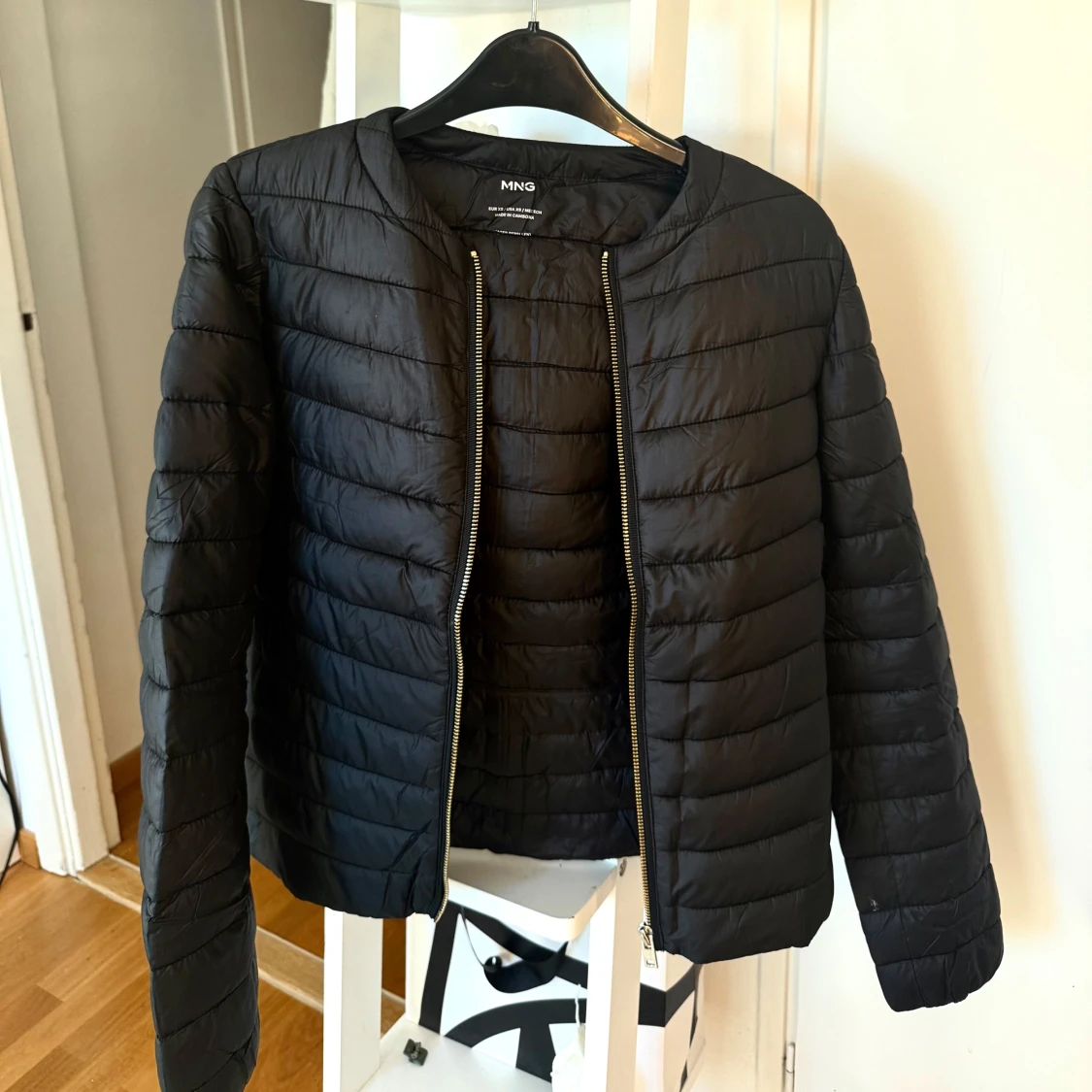 Svart snygg jacka från mango i storlek XS. Jackan har en quiltad design med raka sömmar, rund halsringning och en guld dragkedja framtill. Jackan är använd endast en gång då jag köpte fel storlek men kunde inte lämna tillbaka. Jackan är väldigt lätt💗