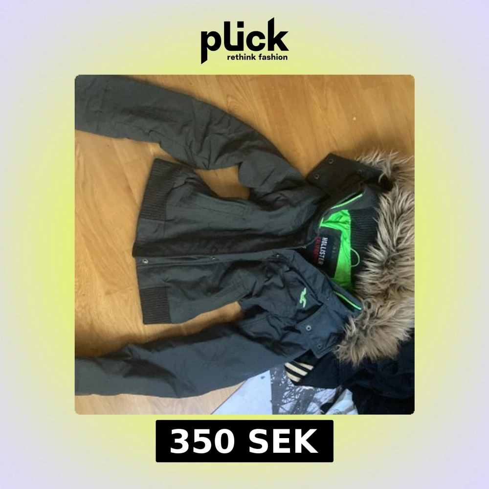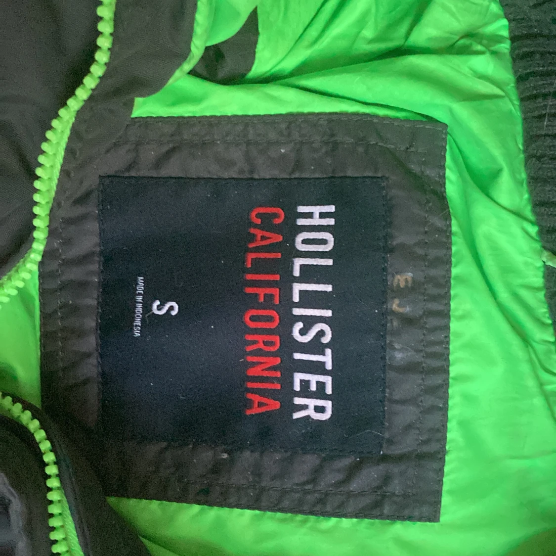 Säljer en svart Hollister jacka i storlek S med päls på luvan och grönt foder. Jackan har ribbade muddar, dragkedja och knappar framtill. Perfekt för dig som gillar streetstyle och vill ha något som sticker ut med den gröna insidan. PRIS GÅR DISKUTERAS!!
