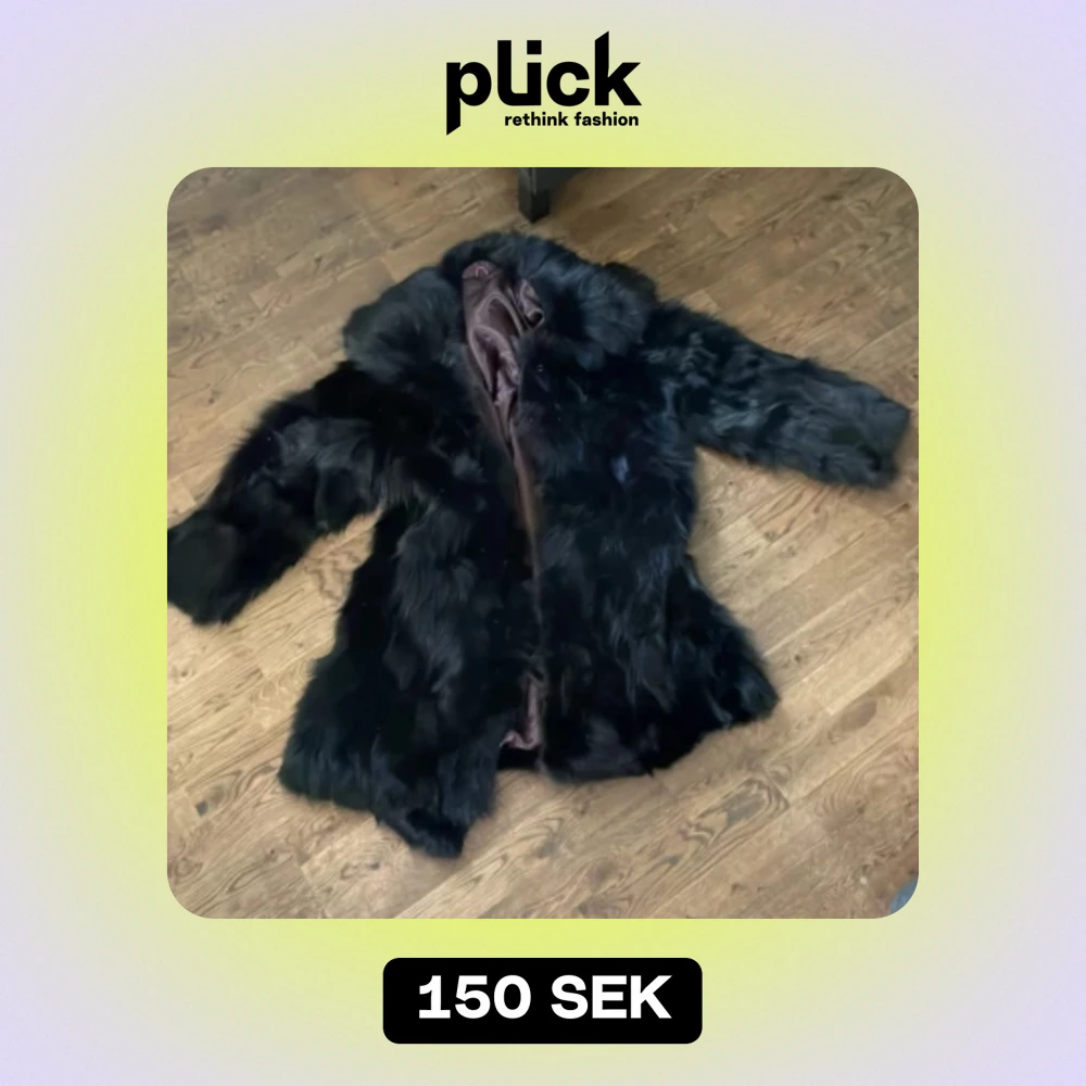 En cool pälsjacka i svart färg med ett stort hål vid kragen. Den passar mig som har ungefär medium. Pälsen är mjuk och varm. Annat än hålet är jackan fortfarande i bra skick.