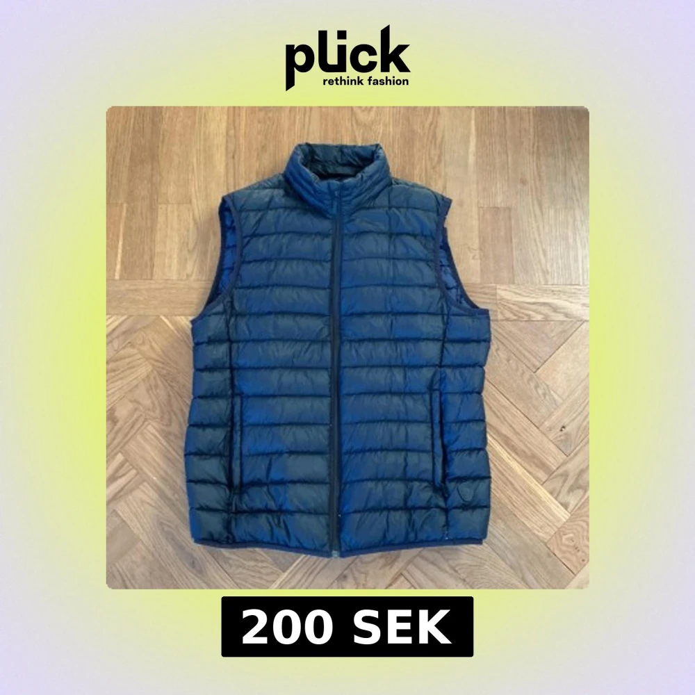 Snygg svart dunväst med marinblå insida och hög krage. Västen har hel dragkedja framtill och två fickor på sidorna. Perfekt att slänga över en hoodie eller tröja för extra värme. Enkel och stilren look som funkar till det mesta.