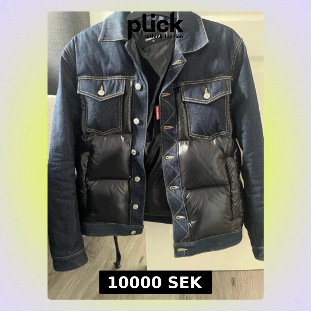 Unik jacka från DSQUARED2 i mörkblå denim med puffer-detaljer i svart blankt material. Snygga kontrastsömmar, två bröstfickor med knappar och stor DSQUARED2-logga på ryggen. Jackan har knappstängning och cool mix av jeans och pufferstil.