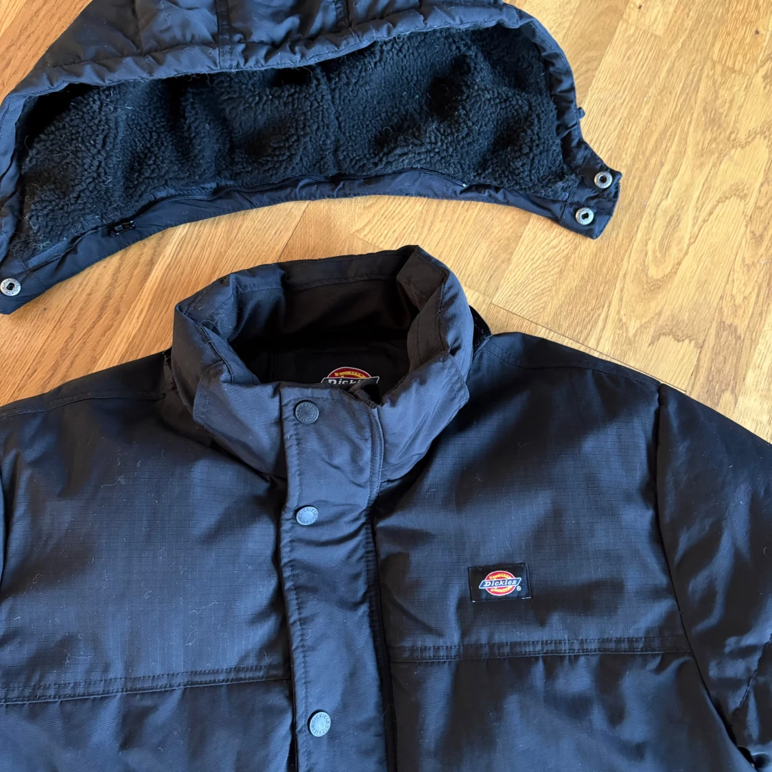 En mycket varm dunjacka från dickies med avtagbar luva och päls i fickorna. Innerficka finns, inga fläckar eller skador. Den är oversize så är en storlek S som är som en M.