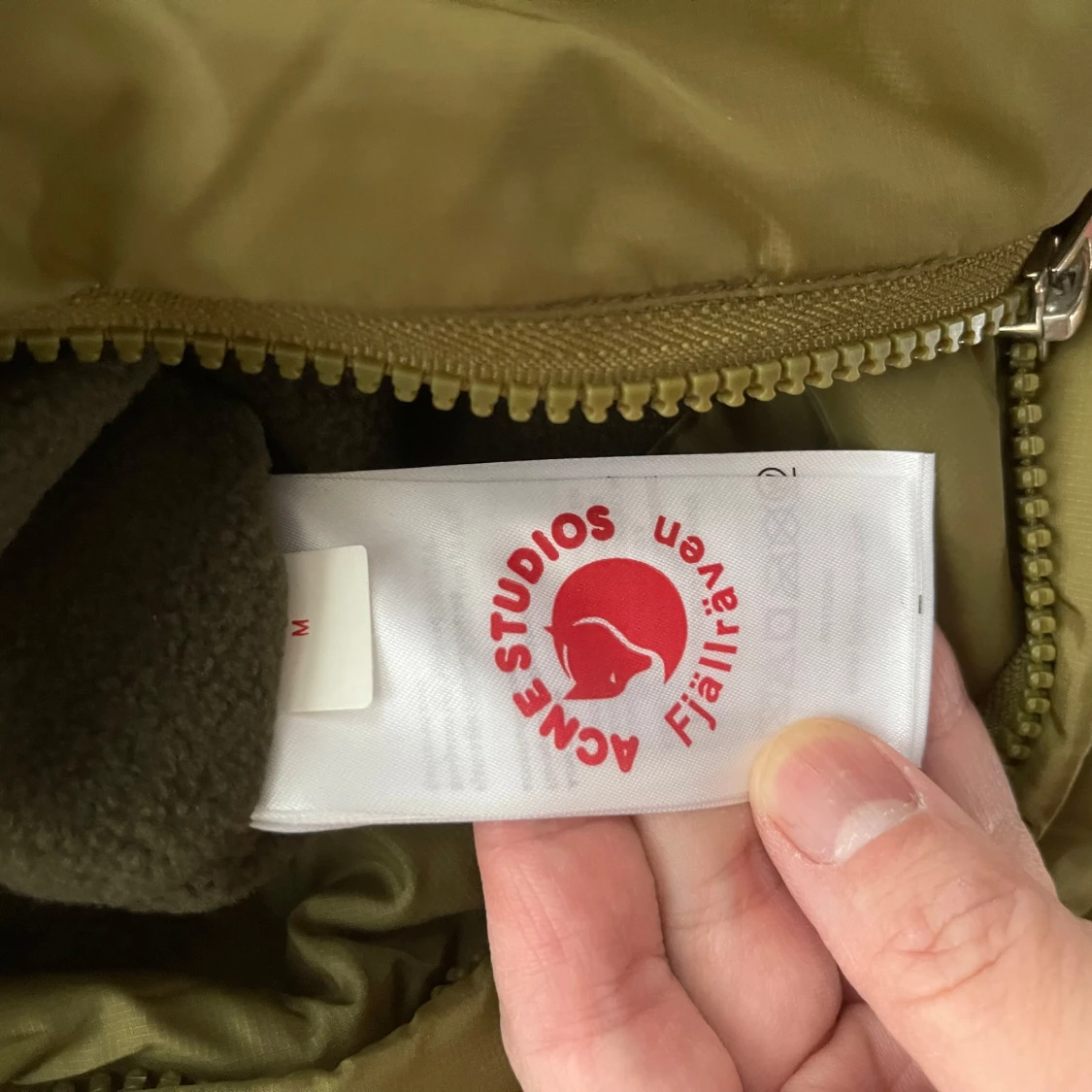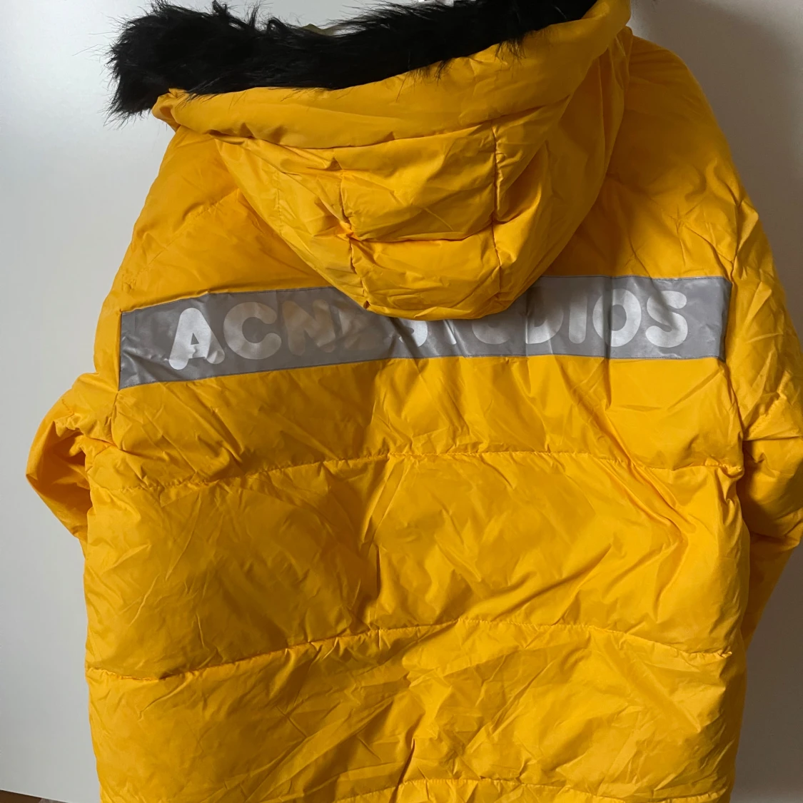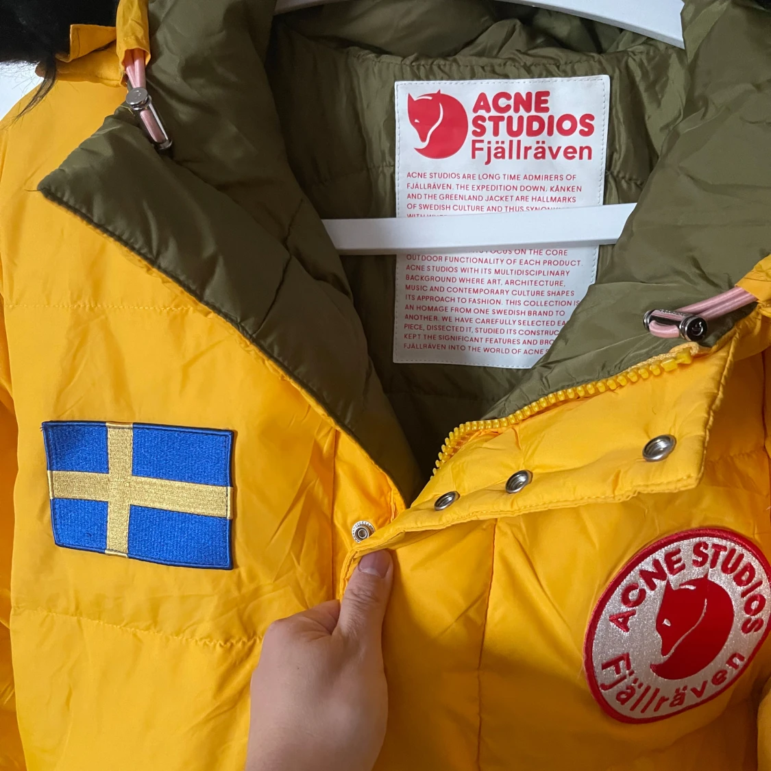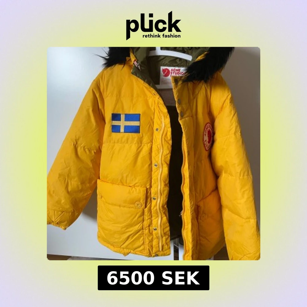 Säljer en cool gul dunjacka från Acne Studios x Fjällräven med svensk flagga och logotypdetaljer. Jackan har en avtagbar huva med svart päls och knäppning framtill. Perfekt för kalla dagar!