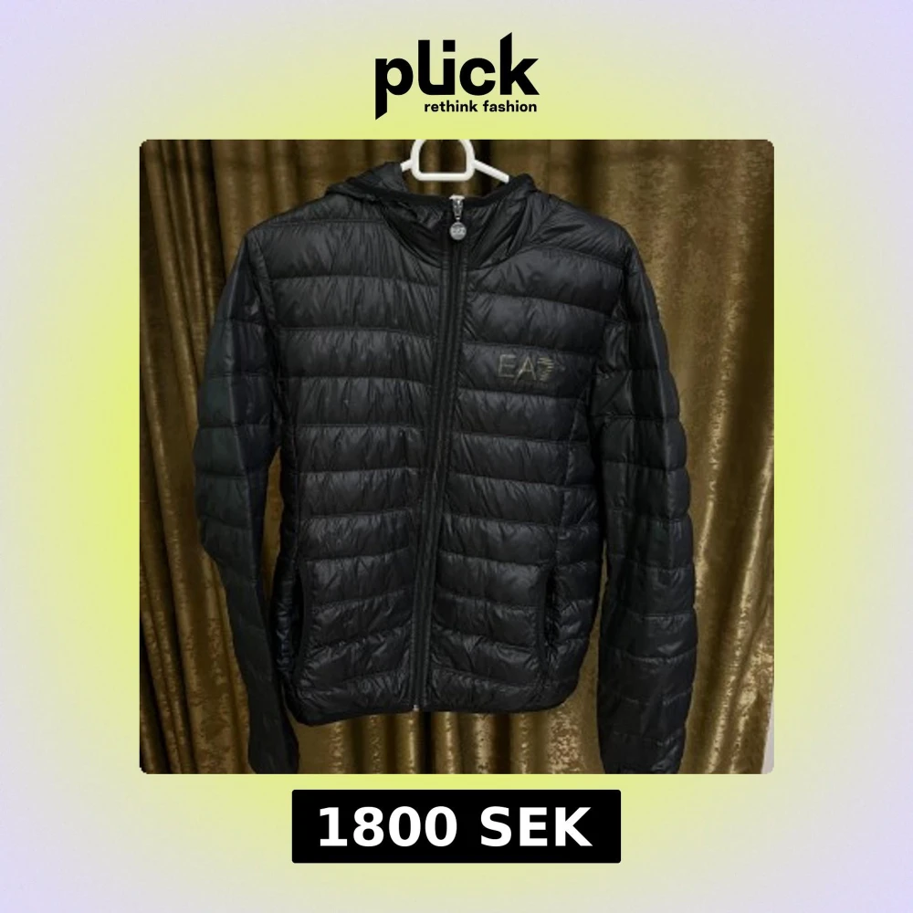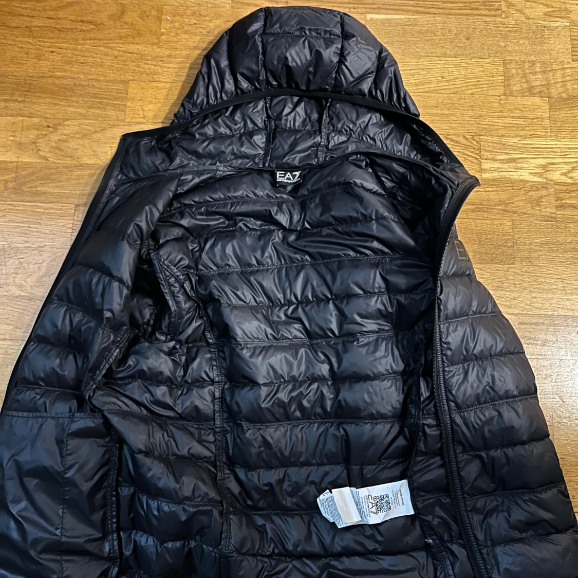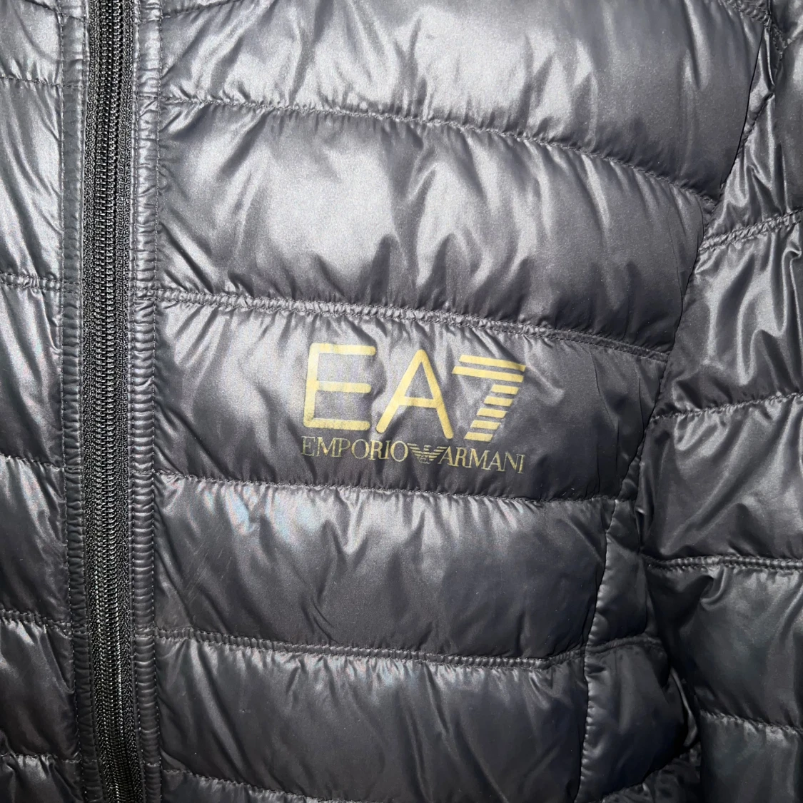Säljer en svart dunjacka från EA7 Emporio Armani med huva och dragkedja. Jackan har quiltad design och logga i guld på bröstet. Perfekt för kyliga dagar och riktigt snygg till streetwear-stilen.