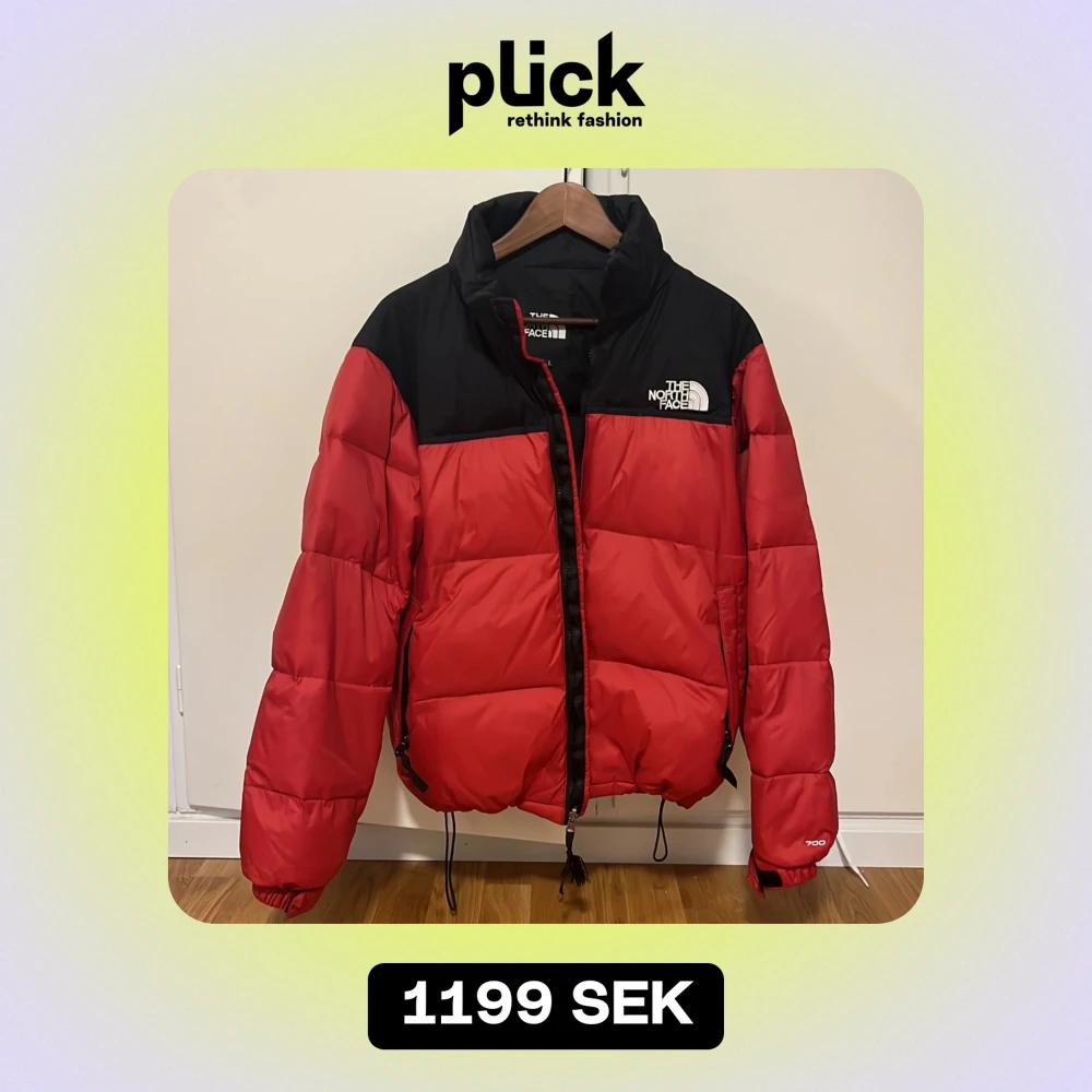 Säljer en snygg och varm röd dunjacka från The North Face med svarta detaljer. Perfekt för kalla vinterdagar. Den är i mycket bra skick och har justerbara snören i nederkant för bästa passform. Står att det är storlek L men sitter som S