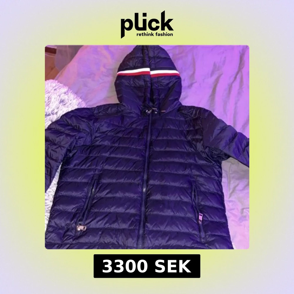 Säljer en snygg mörkblå dunjacka från Moncler med huva och dragkedja. Jackan har ett stilrent randigt mönster i rött och vitt på huvan och Moncler-logga på ärmen. Perfekt för kyliga dagar! sitter som en s står ingen storlek❤️ priset går och diskutera